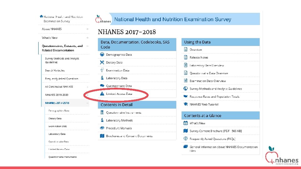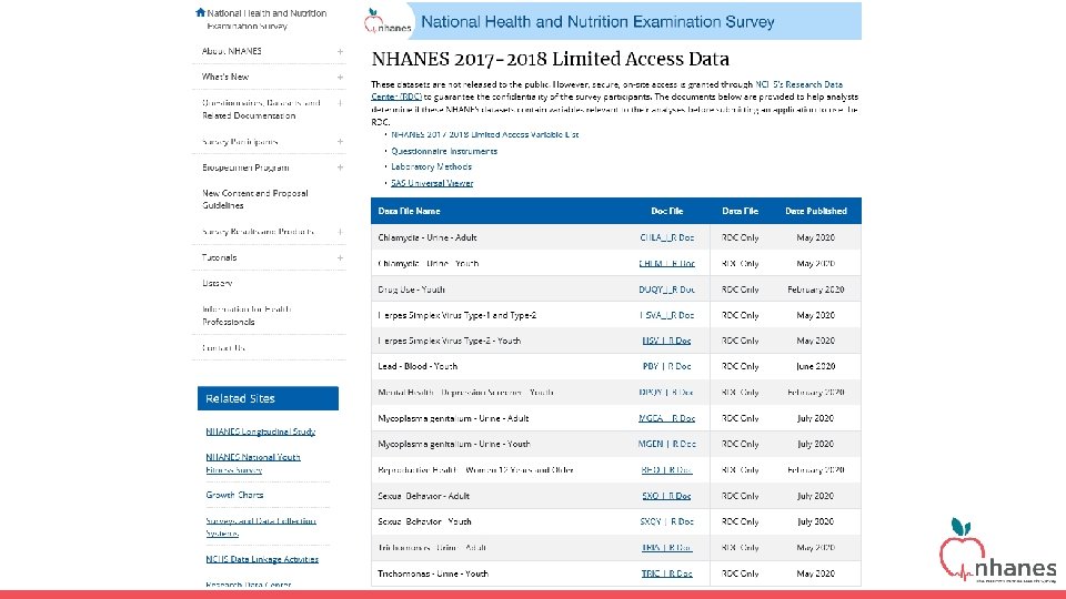 NHANES 2017 – 2018 Data Release Percent of 2017 -18 NHANES Data Files Released, In Process, or Not Yet Ready (n=152) • First set of 2017– 2018 data released in February 2020. 16% • As of September 1, nearly twothirds of all 2017 -18 data files have been released. 18% 66% # Not Ready # In Process # Released