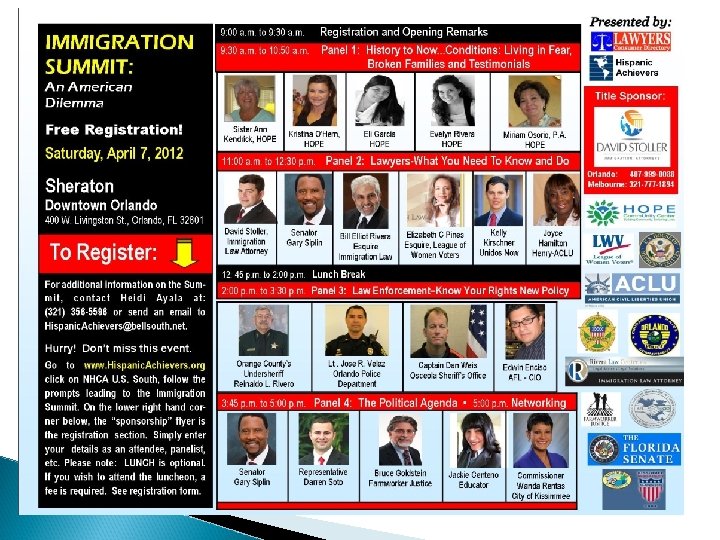 We accomplish our Mission by: 1. Our weekly Hispanics Speak. Out TV show which has been broadcast on Bright House Networks for 9 consecutive years. Chann el www. Hispanics. Speakout. TV 49 2. Promote the hiring, retention and promoting of Hispanic professionals at the Corporate level. www. Hispanic. Achievers. org 3. Promote the hiring of Hispanics in Central Florida by providing the community with Diversity Career Fairs.