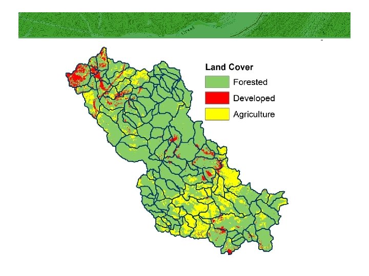 Uses of modeling results • Watershed modeling is used in assessment of the influence of landscape factors on instream water quality and biota • Linking landscape factors is made possible by mapped segmentlevel watersheds