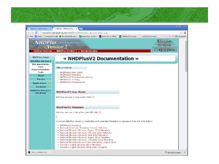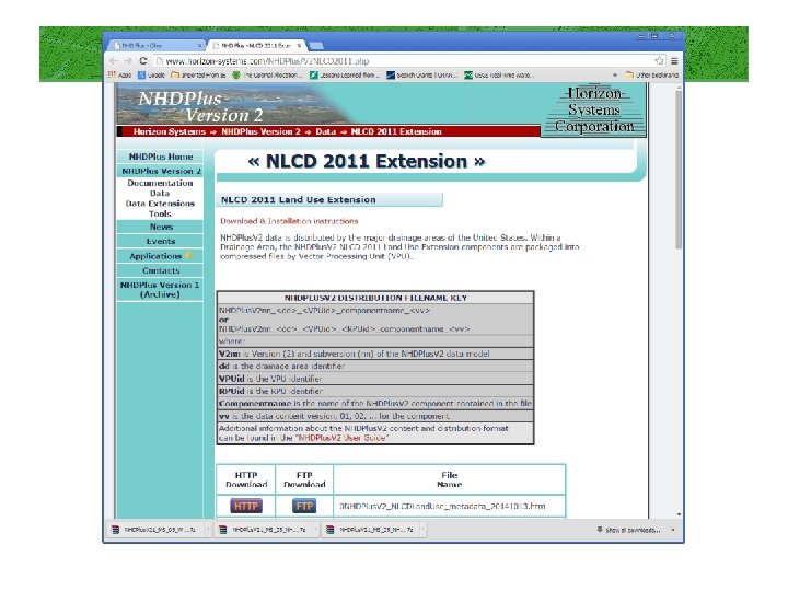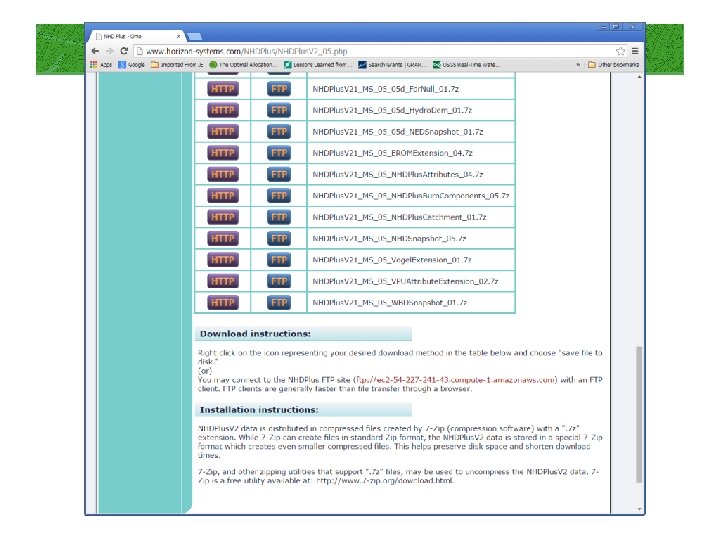 Useful datasets to download See NHDPlus v 2 Users Guide for a description of field names/contents in each dataset below. NHD Snapshot (this includes the NHD flowlines (streams), waterbodies, area features, etc. it is called a “snapshot” because it is not updated as the NHD is updated – it is from a single point in time when the NHDPlus v 2 was created (not generally a problem) NED Snapshot (this includes the NED elevation data) NHDPlus Catchment: these are the catchment boundaries. They are generally related to the flowlines using FEATUREID (which is same as flowline COMID) and may be joined using those attributes. However, there is not always a 1: 1 relationship between flowlines & catchments (not all flowlines will have catchments I think) but usually doesn’t cause an issue, unless you are using “homegrown” routines to navigate the flow network. NHDPlus Attributes: an attribute table (dbf) that can be joined to the catchments and/or flowlines. Includes lots of useful information, including stream order, whether segment is a divergence or not, cumulative area Vogel Extension: Includes flow estimates (mean annual flow) for each catchment/flowline Precipitation and Temperature: mean annual precipitation and mean annual temperature datasets by catchment (note values – see Users Guide). Data from PRISM. NLCD data extension: NLCD 2011 data have been summarized already by NHDPlus catchments. If this is needed, can be downloaded here: http: //www. horizon-systems. com/NHDPlus/V 2 NLCD 2011. php. WBD Snapshot: WBD is watershed boundary dataset (NRCS 12 -digit watersheds).