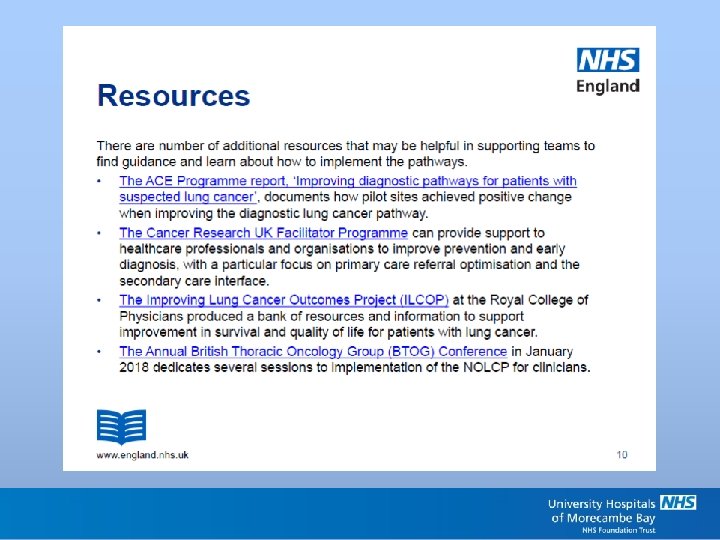 Implementation of the National Optimal Lung Pathway (NOLP) • In a nutshell; • Currently – definitive treatment to be achieved by day 62 • Future – diagnosis by day 28, treatment by day 49