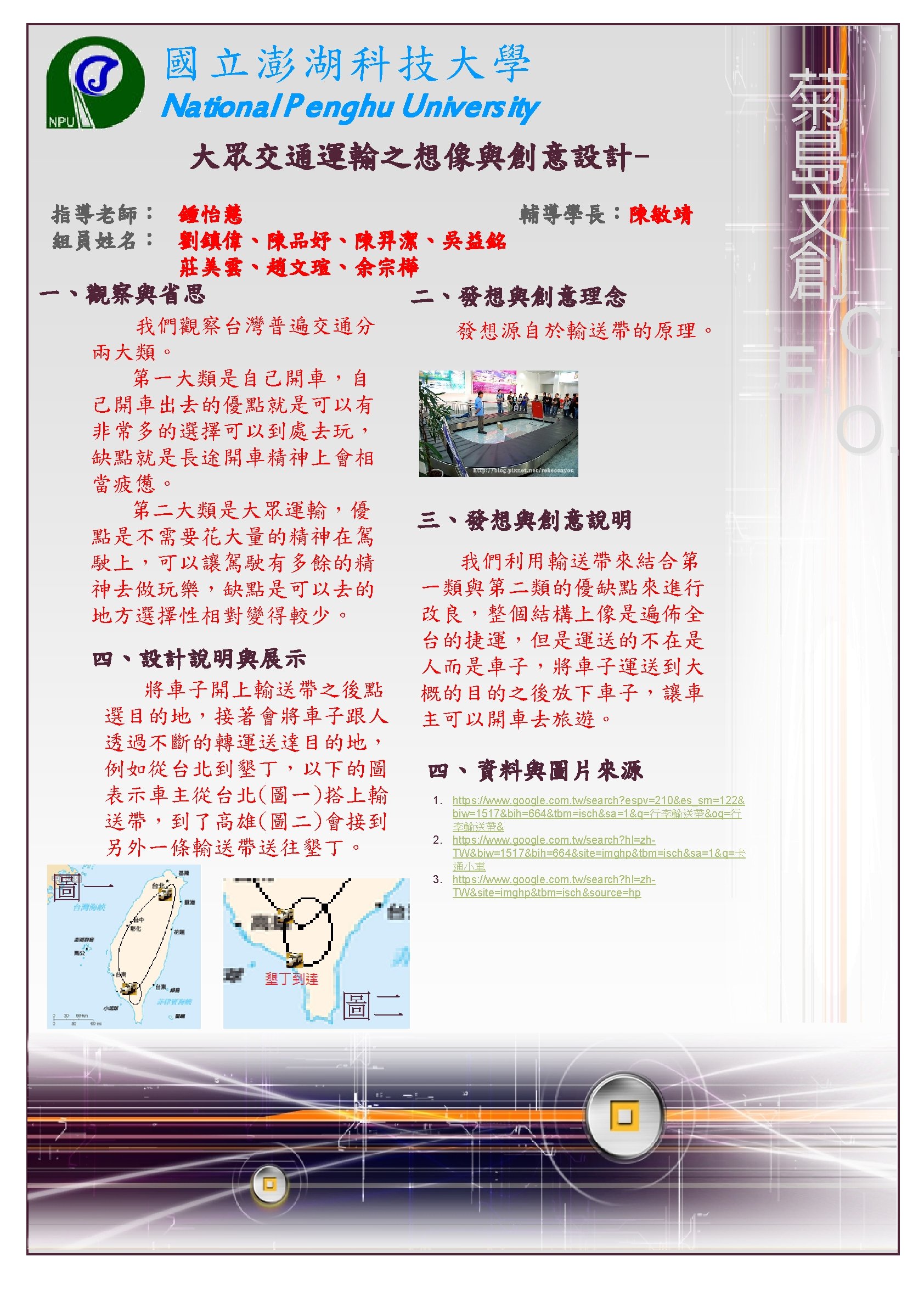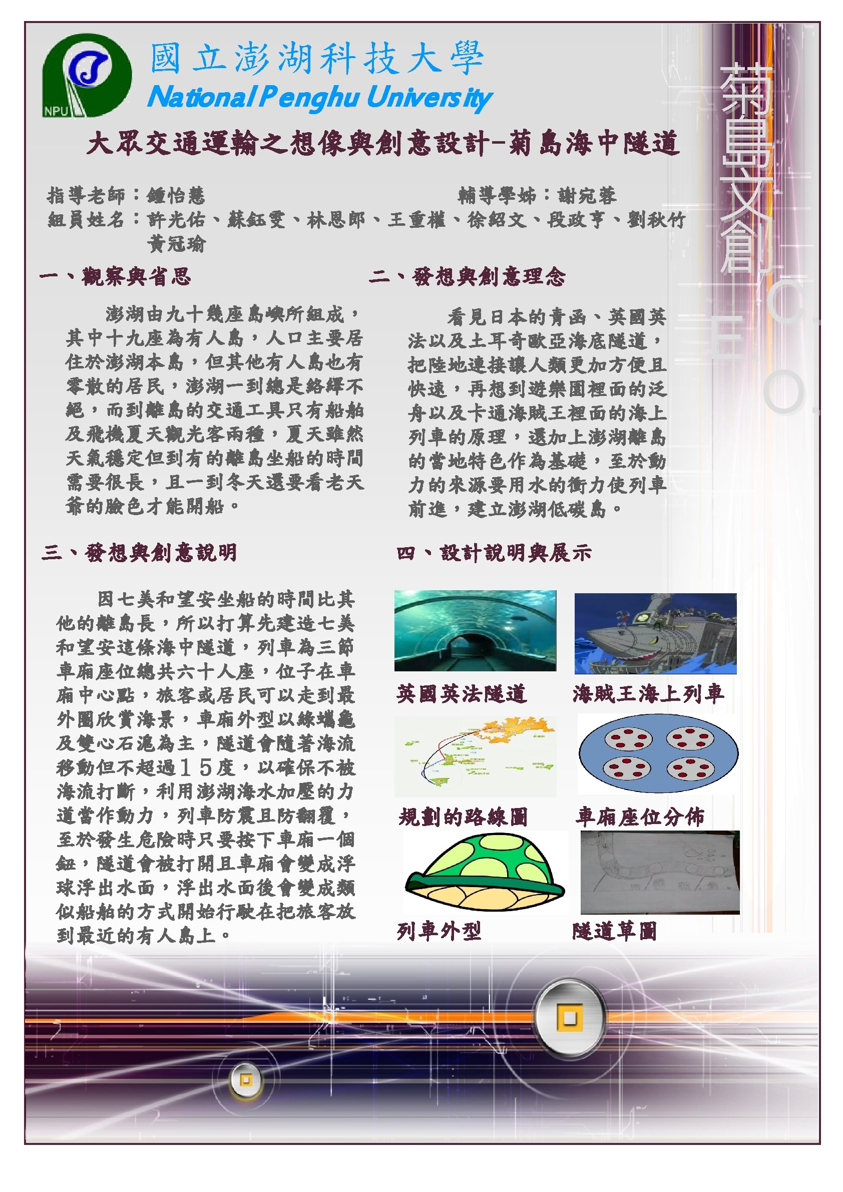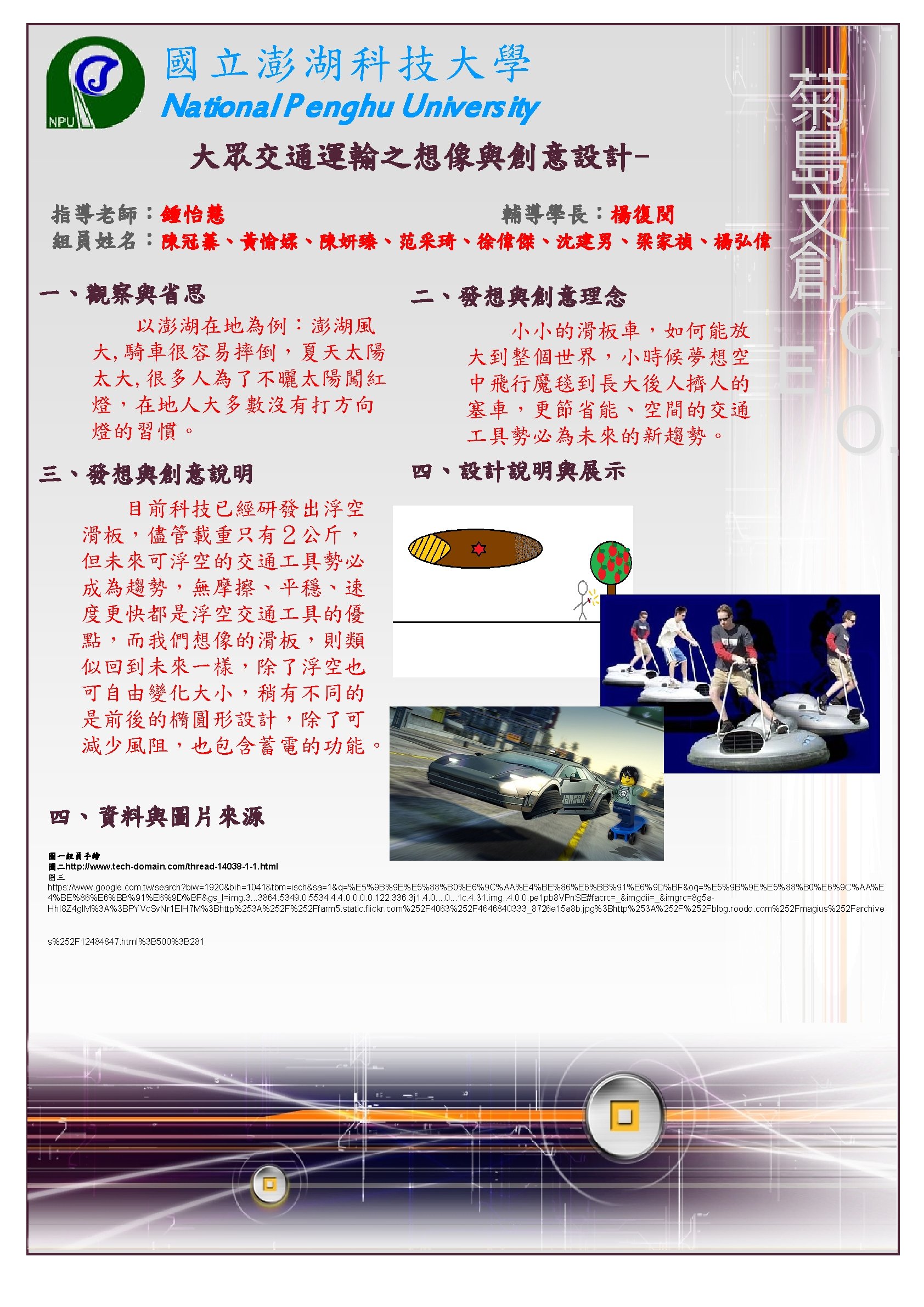 國立澎湖科技大學 National P enghu Univers ity 大眾交通運輸之想像與創意設計指導老師:鍾怡慧 輔導學長:楊復閔 組員姓名:沈佩馨、鄭華欣、許佳雯、陳毓儀、吳志軒、吳瑞國、蘇雅微 一、觀察與省思 二、發想與創意理念 在油價日漸上漲的時代, 機票也勢必漲價,為了避免因 為漲價導致澎湖觀光衰弱,勢 必要推出新的、更節能的交通 具。 三、發想與創意說明 有效的運用空間,節省時 間和能源,能變大變小的公車, 在塞車的尖峰時段也不至於動 彈不得,並且在無人時也較節 省停車空間。 四、設計說明與展示 菊 島 文 創 C. E. O. 相信大家小時候都有看過 龍貓,這部片的龍貓公車會隨 著車內人數改變大小,而我們 的海之參,則取用澎湖在地的 海參會因為吸水變大變小的特 性,就像人流量一樣,在人少 的時候會縮小,增加車道容量, 也能減少風阻,並且我們也為 其配備一系列節能設備,太陽 能板、風力再生能在未來更有 實現性。 四、資料與圖片來源 圖一、圖二 組原手繪 圖三 https: //www. google. com. tw/search? q=%E 9%BE%8 D%E 8%B 2%93%E 5%85%AC%E 8%BB%8 A&source=lnms&tbm=isch&sa=X&ei=ppq. MUqv. ALYu. Gkg. X 91 o. Co. Bw&ved=0 CAc. Q_AUo. A Q&biw=1920&bih=1041#facrc=_&imgdii=_&imgrc=czciylkx. Byg. O 5 M%3 A%3 BYvd 4 ZIqoy 75 ah. M%3 Bhttp%253 A%252 Fblog. chinatimes. com%252 Fimages%252 Fchinatimes_com %252 Fonlooker%252 F 2718%252 F%2525 E 9%2525 BE%25258 D%2525 E 8%2525 B 2%252593%2525202. jpg%3 Bhttp%253 A%252 Fblog. chinatimes. com%252 Fonlooker%252 Far chive%252 F 2008%252 F 01%252 F 11%252 F 234571. html%3 B 400%3 B 300 圖四 https: //www. google. com. tw/search? q=%E 9%BE%8 D%E 8%B 2%93%E 5%85%AC%E 8%BB%8 A&source=lnms&tbm=isch&sa=X&ei=ppq. MUqv. ALYu. Gkg. X 91 o. Co. Bw&ved=0 CAc. Q_AUo. A Q&biw=1920&bih=1041#facrc=_&imgdii=_&imgrc=Baxl. E 7 Skhtx. Tx. M%3 A%3 Bto 3 QQ-q. RFwaa. WM%3 Bhttp%253 A%252 Fpic. pimg. tw%252 Fhollycow%252 F 13437909553955742742. jpg%3 Bhttp%253 A%252 Fhollycow. pixnet. net%252 Fblog%252 Fpost%252 F 91908847%2525 E 5%2525 B 7%2525 B 4%2525 E 5%2525 A 3%2525 AB%2525 E 8%2525 AD%2525 E 8%2525 A 8%252588%2525 E 5%2525 BE%25259 E%2525 E 5%2525 B 9%2525 BB%2525 E 6%252583%2525 B 3%2525 E 5%252588%2525 B 0%2525 E 7%252590%252586%2525 E 6%252583%2525 B 3%3 B 520 %3 B 346