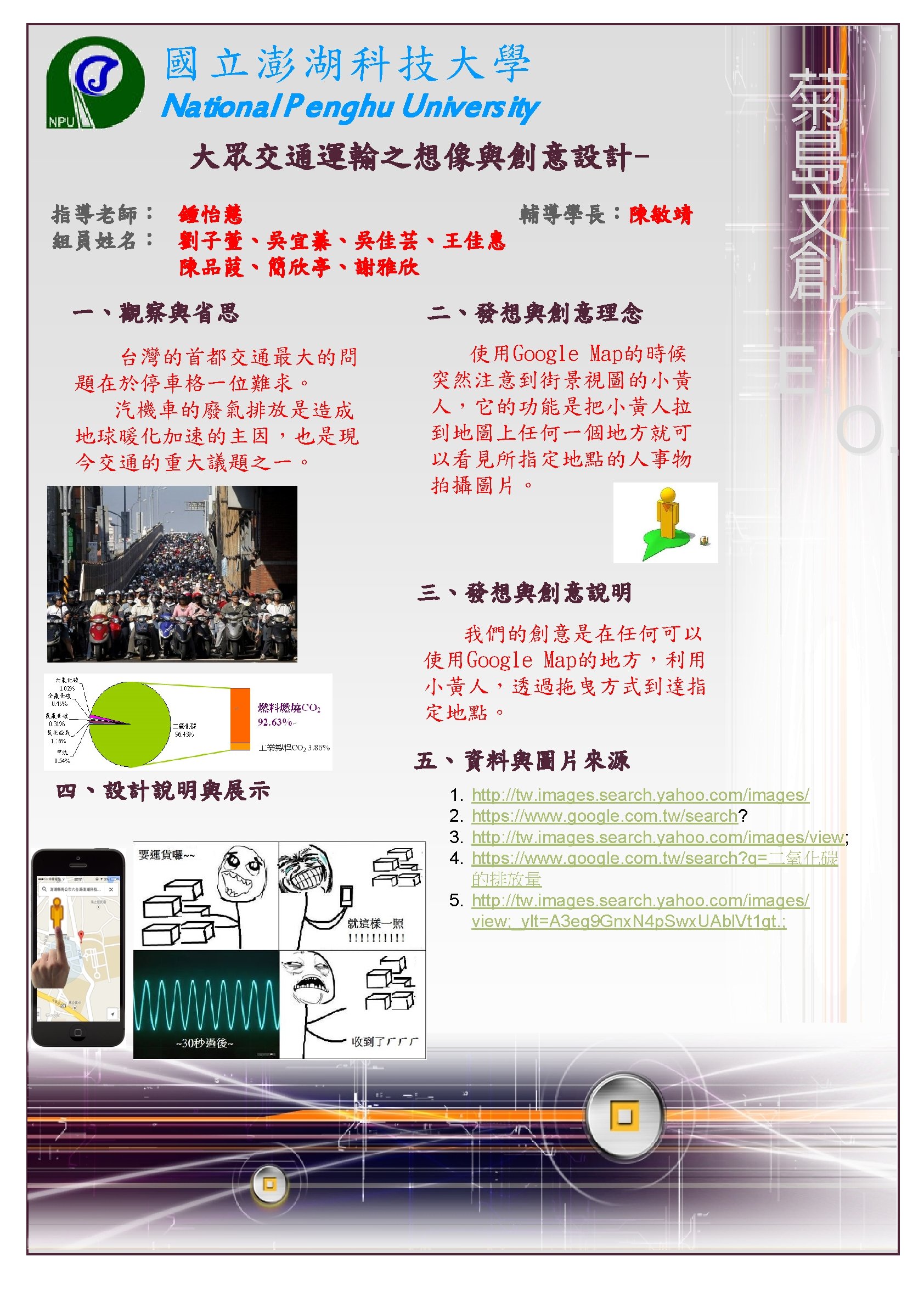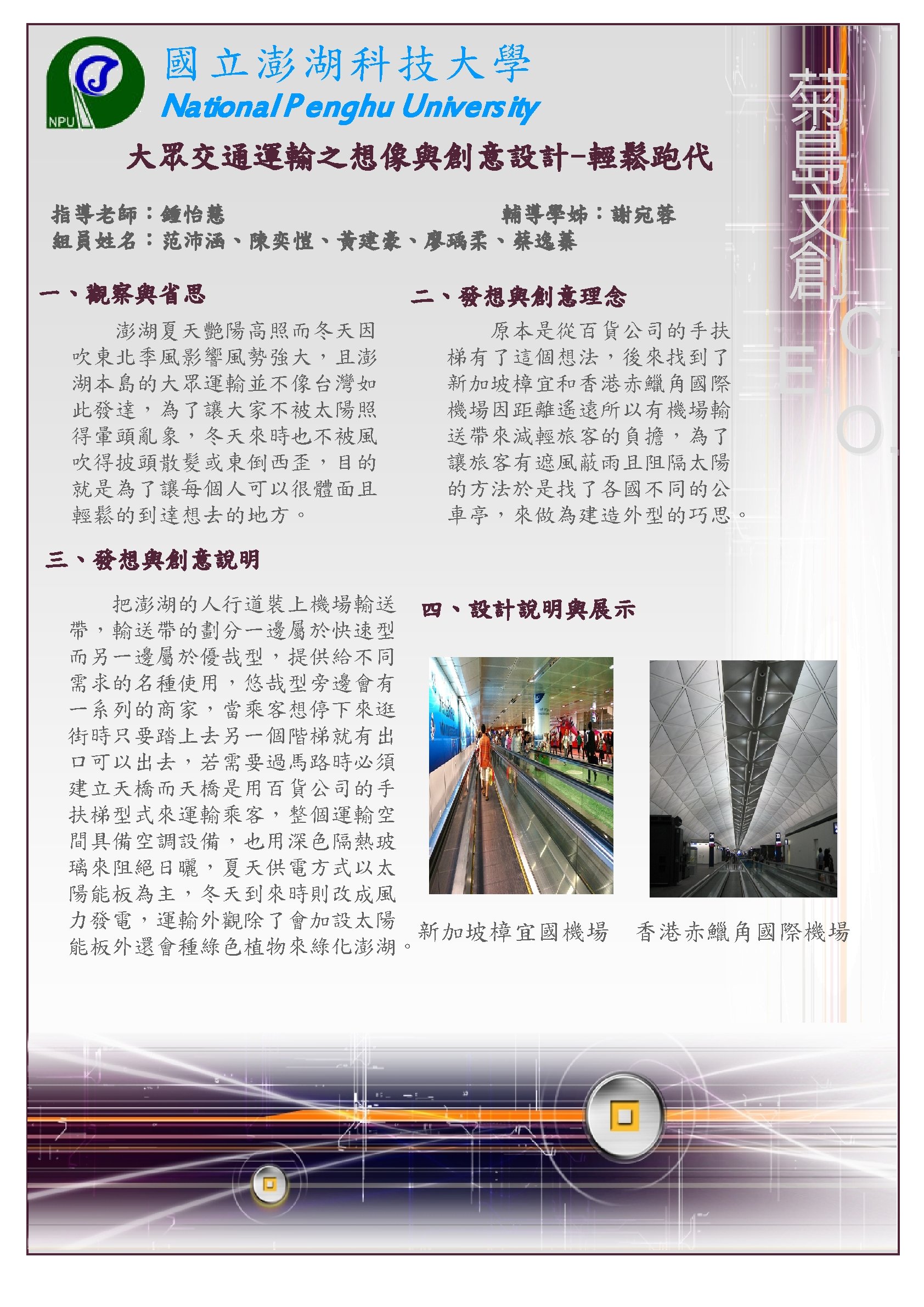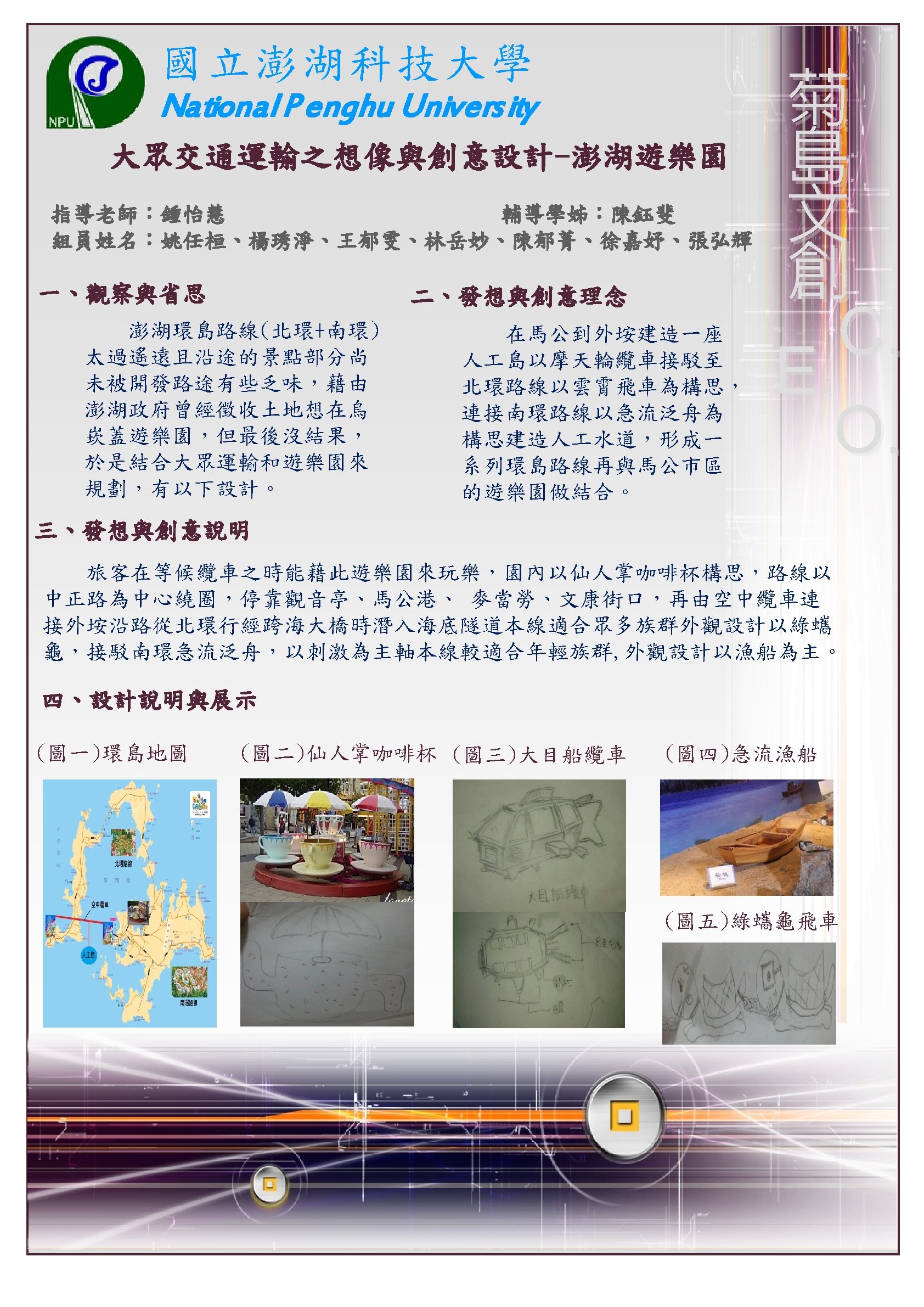 國立澎湖科技大學 National P enghu Univers ity 大眾交通運輸之想像與創意設計指導老師:鍾怡慧 輔導學長:楊復閔 組員姓名:沈佩馨、鄭華欣、許佳雯、陳毓儀、吳志軒、吳瑞國、蘇雅微 一、觀察與省思 二、發想與創意理念 在油價日漸上漲的時代, 機票也勢必漲價,為了避免因 為漲價導致澎湖觀光衰弱,勢 必要推出新的、更節能的交通 具。 三、發想與創意說明 有效的運用空間,節省時 間和能源,能變大變小的公車, 在塞車的尖峰時段也不至於動 彈不得,並且在無人時也較節 省停車空間。 四、設計說明與展示 菊 島 文 創 C. E. O. 相信大家小時候都有看過 龍貓,這部片的龍貓公車會隨 著車內人數改變大小,而我們 的海之參,則取用澎湖在地的 海參會因為吸水變大變小的特 性,就像人流量一樣,在人少 的時候會縮小,增加車道容量, 也能減少風阻,並且我們也為 其配備一系列節能設備,太陽 能板、風力再生能在未來更有 實現性。 四、資料與圖片來源 圖一、圖二 組原手繪 圖三 https: //www. google. com. tw/search? q=%E 9%BE%8 D%E 8%B 2%93%E 5%85%AC%E 8%BB%8 A&source=lnms&tbm=isch&sa=X&ei=ppq. MUqv. ALYu. Gkg. X 91 o. Co. Bw&ved=0 CAc. Q_AUo. A Q&biw=1920&bih=1041#facrc=_&imgdii=_&imgrc=czciylkx. Byg. O 5 M%3 A%3 BYvd 4 ZIqoy 75 ah. M%3 Bhttp%253 A%252 Fblog. chinatimes. com%252 Fimages%252 Fchinatimes_com %252 Fonlooker%252 F 2718%252 F%2525 E 9%2525 BE%25258 D%2525 E 8%2525 B 2%252593%2525202. jpg%3 Bhttp%253 A%252 Fblog. chinatimes. com%252 Fonlooker%252 Far chive%252 F 2008%252 F 01%252 F 11%252 F 234571. html%3 B 400%3 B 300 圖四 https: //www. google. com. tw/search? q=%E 9%BE%8 D%E 8%B 2%93%E 5%85%AC%E 8%BB%8 A&source=lnms&tbm=isch&sa=X&ei=ppq. MUqv. ALYu. Gkg. X 91 o. Co. Bw&ved=0 CAc. Q_AUo. A Q&biw=1920&bih=1041#facrc=_&imgdii=_&imgrc=Baxl. E 7 Skhtx. Tx. M%3 A%3 Bto 3 QQ-q. RFwaa. WM%3 Bhttp%253 A%252 Fpic. pimg. tw%252 Fhollycow%252 F 13437909553955742742. jpg%3 Bhttp%253 A%252 Fhollycow. pixnet. net%252 Fblog%252 Fpost%252 F 91908847%2525 E 5%2525 B 7%2525 B 4%2525 E 5%2525 A 3%2525 AB%2525 E 8%2525 AD%2525 E 8%2525 A 8%252588%2525 E 5%2525 BE%25259 E%2525 E 5%2525 B 9%2525 BB%2525 E 6%252583%2525 B 3%2525 E 5%252588%2525 B 0%2525 E 7%252590%252586%2525 E 6%252583%2525 B 3%3 B 520 %3 B 346