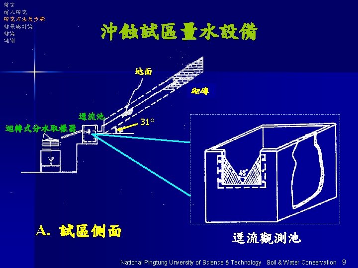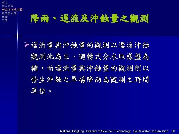 前言 前人研究 研究方法及步驟 結果與討論 結論 謝致 逕流觀測池 迴轉式分水取樣器 National Pingtung Unversity of Science & Technology Soil & Water Conservation