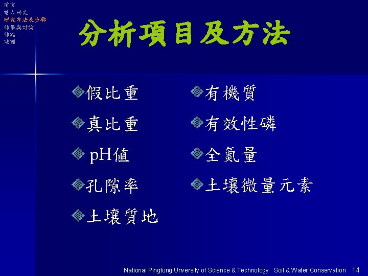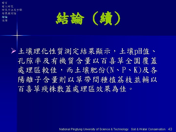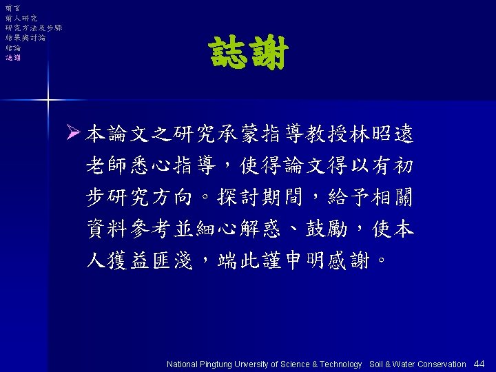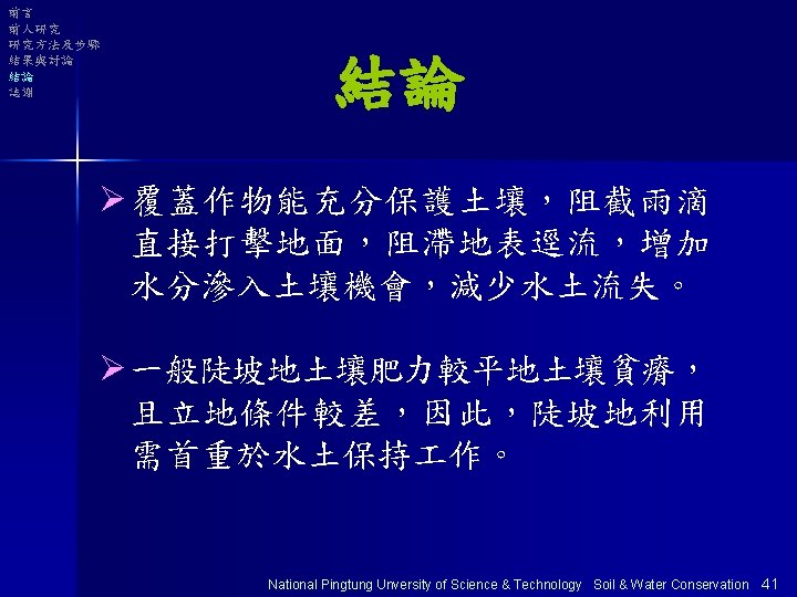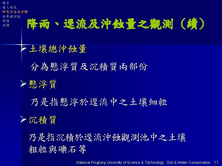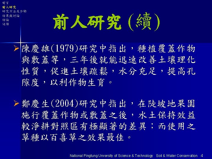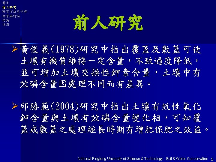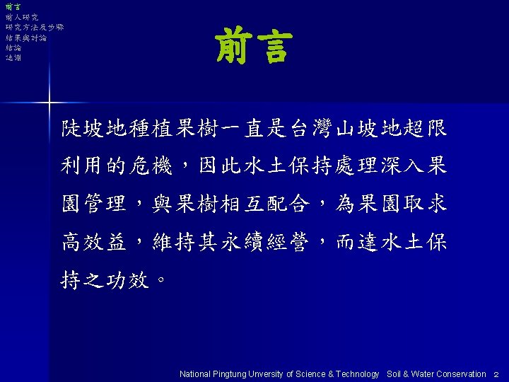 大綱 Ø前言 Ø前人研究 Ø研究方法及步驟 Ø結果與討論 Ø結論 Ø誌謝 National Pingtung Unversity of Science & Technology Soil & Water Conservation 1