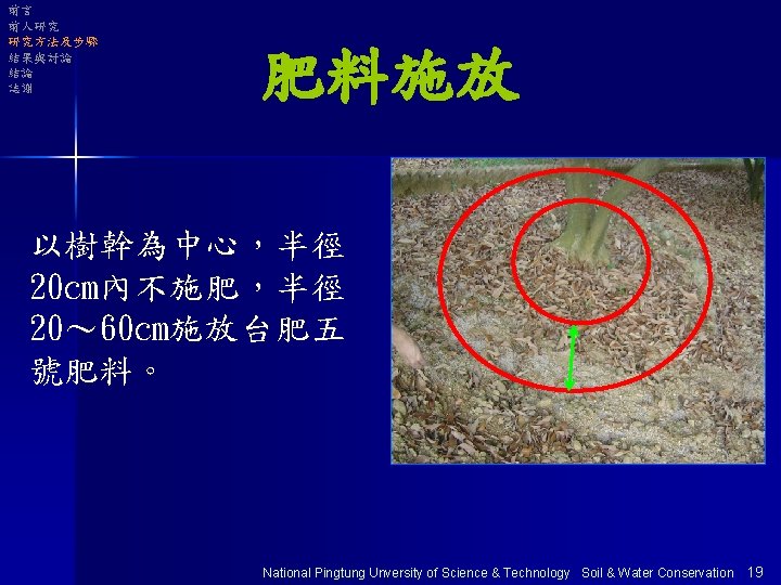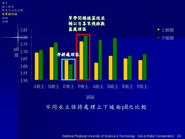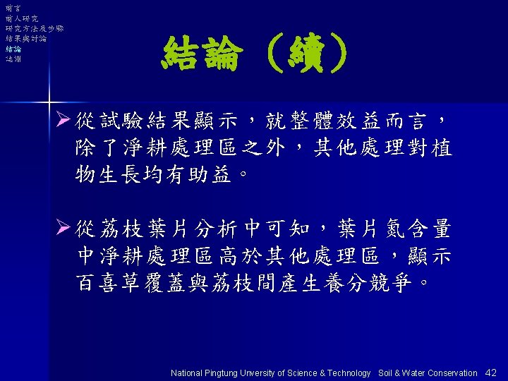 前言 前人研究 研究方法及步驟 結果與討論 結論 誌謝 荔枝加百喜草全 園覆蓋處理區 淨耕處理區 National Pingtung Unversity of Science & Technology Soil & Water Conservation 25