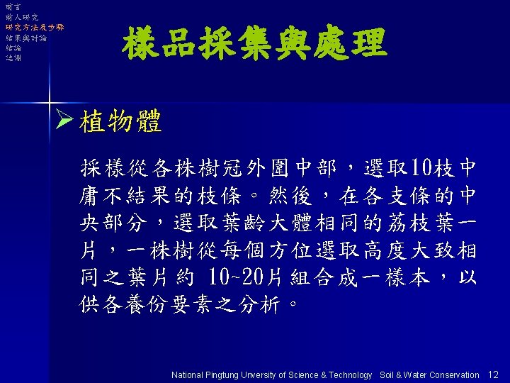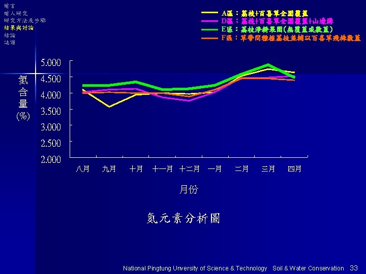 前言 前人研究 研究方法及步驟 結果與討論 結論 誌謝 各處理區荔枝葉片 養分含量分析 National Pingtung Unversity of Science & Technology Soil & Water Conservation 32
