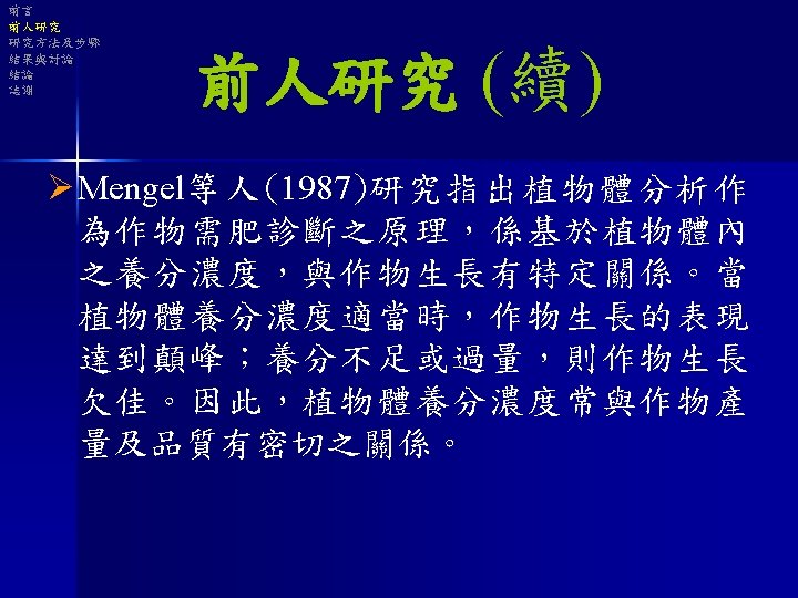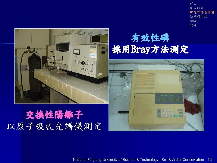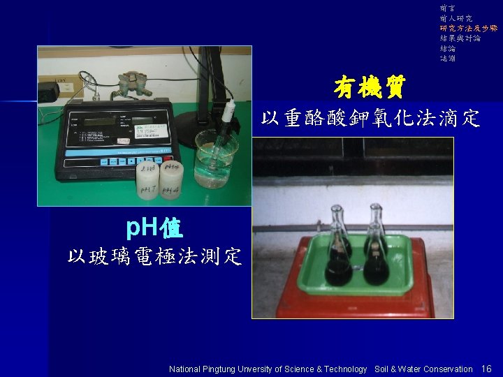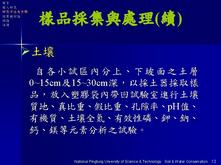 前言 前人研究 研究方法及步驟 結果與討論 結論 誌謝 全氮量 以凱式分析瓶法測定 National Pingtung Unversity of Science & Technology Soil & Water Conservation 17