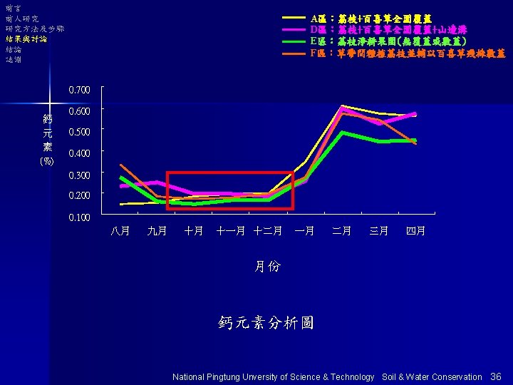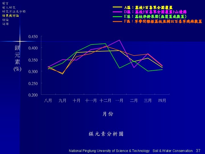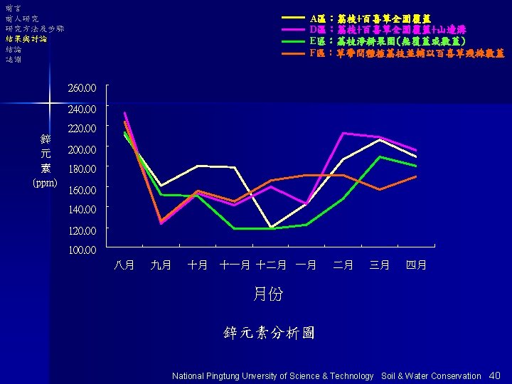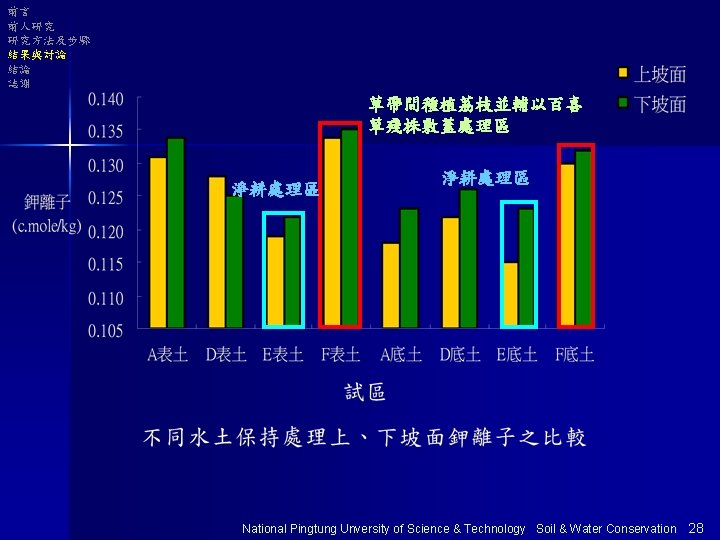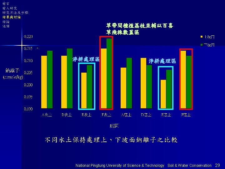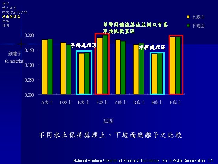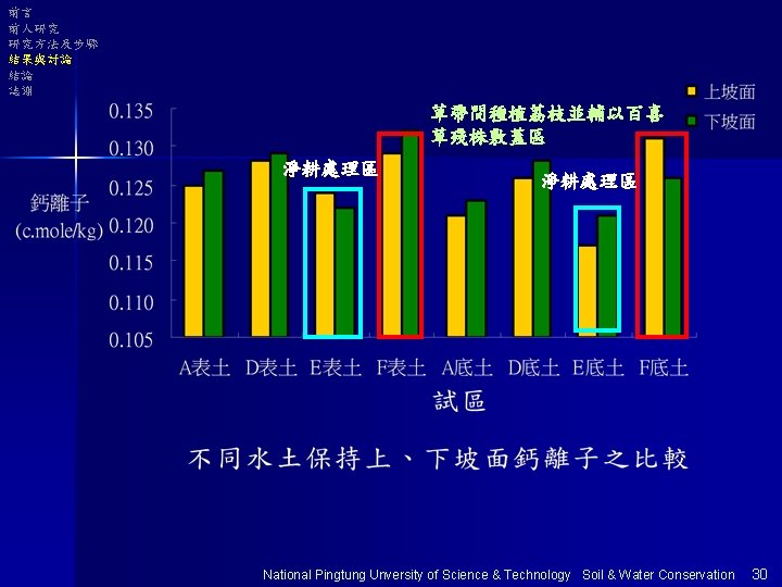 前言 前人研究 研究方法及步驟 結果與討論 結論 誌謝 以E區為基準分析 Na+ 表土 底土 Ca+ 表土 底土 單位 :% Mg+ 表土 底土 E 100 100 100 A 100 98 101 103 135 D 97 98 103 108 127 124 F 100 96 106 112 133 135 National Pingtung Unversity of Science & Technology Soil & Water Conservation