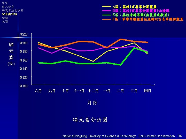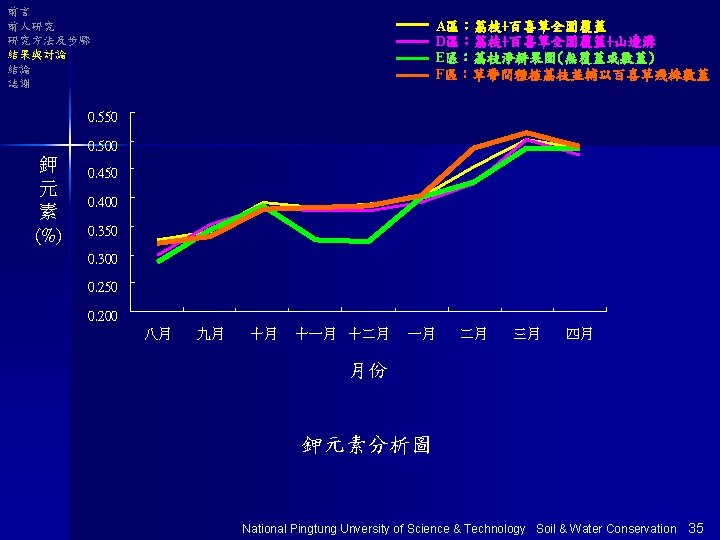 前言 前人研究 研究方法及步驟 結果與討論 結論 誌謝 以E區為基準分析 單位 :% 有機質 全氮量 有效磷 K+ 表土 底土 E 100 100 A 149 131 111 145 171 110 102 D 129 125 129 116 139 127 108 106 F 113 109 126 112 178 207 110 113 National Pingtung Unversity of Science & Technology Soil & Water Conservation