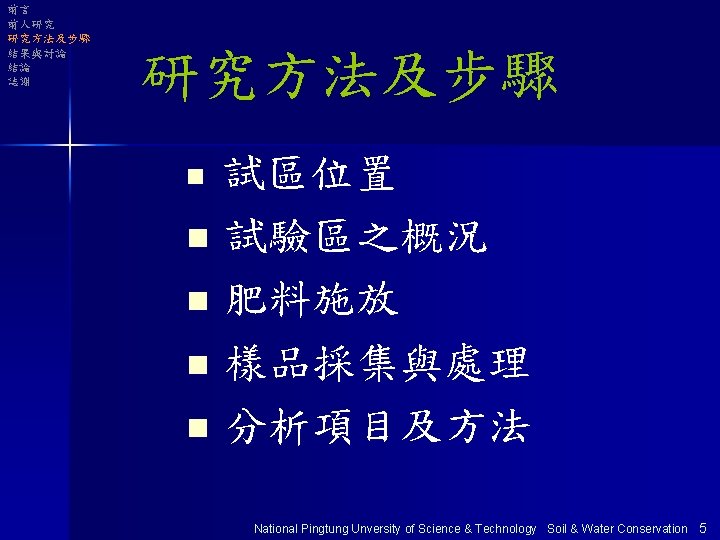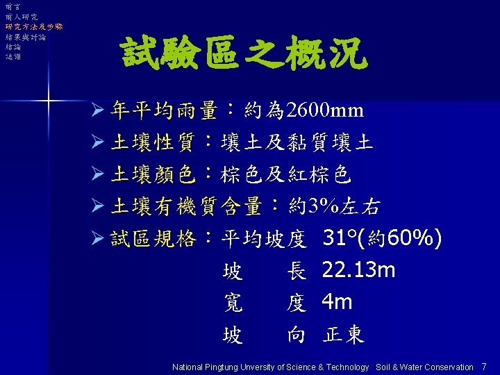 前言 前人研究 研究方法及步驟 結果與討論 結論 誌謝 試區位置 陡坡地第一試驗區 National Pingtung Unversity of Science & Technology Soil & Water Conservation 6