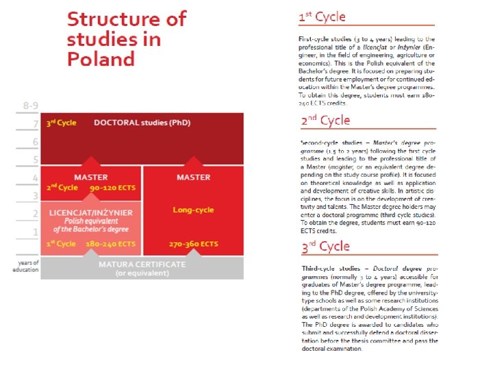 More opportunities in higher education As a result of the amendment to the higher education law of March 18, 2011, higher education institutions were given more autonomy to develop curricula as of the 2011 -2012 academic year. They are no longer required to refer to a specific list of educational content, i. e. a central list of course names with an allocated framework of educational content that must be included in curricula. Now they are able to independently plan fields of study, taking into consideration the skills and competences a graduate will have upon graduation. Higher education institutions are bound by a universal description of the three highest levels in the national qualifications framework (i. e. doctoral, master’s, licentiate and engineering studies). Furthermore, they have sets of learning outcomes for general fields of study: the humanities, the exact sciences, social, natural sciences, technical, veterinary, medical sciences and the arts. These sets of outcomes are generalised, so that they can be applied in various areas and fields of study. For example, the field of social sciences can include law, sociology or management, while the exact sciences can include mathematics or physics.