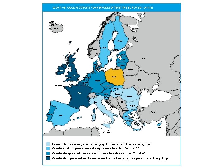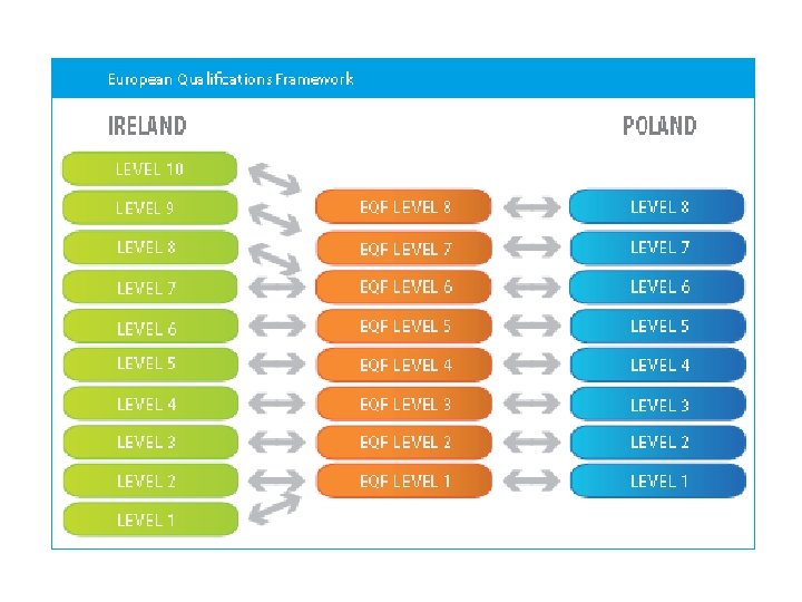 The Polish and European qualifications frameworks Work on the Polish Qualifications Framework is part of a process covering the entire European Union, and is linked to facilitating mobility in the open EU labour market and promoting the concept of lifelong learning. The Polish Qualifications Framework will be referenced to the European Qualifications Framework (EQF), a system implemented to facilitate freedom of movement within the European labour market and to better adapt qualifications to employers’ expectations. Seeing the obvious benefit, all European Union member states are voluntarily developing frameworks and referencing reports describing the links between their national frameworks and the European framework – it is essential for the system of qualifications in Europe to be cohesive and comparable. EU member state frameworks already in existence, in the process of being implemented or still at the planning stage differ in the number of qualification levels (e. g. Ireland has 10, while Scotland has 12) and institutions. European countries also have different educational systems. The EQF is a type of “universal translator” for qualification levels and thus also learning outcomes.