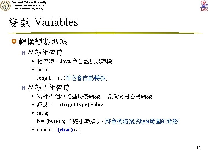 National Taiwan University Department of Computer Science and Information Engineering 變數 Variables 常數 語法:final Data. Type Var. Name = Initial. Value; 一旦變數被宣告成 final,其值將不可再更改 若程式欲更改 final 變數的值將造成編譯時期錯誤( compile-time error) 範例: final double PI = 3. 1416; PI = 2. 345; // 會發生錯誤,因為 PI 是常數 13