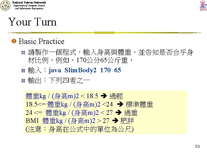 National Taiwan University Department of Computer Science and Information Engineering Your Turn Hint: Slim. Body 2. java public class Slim. Body 2 { public static void main(String[] args) { … // 肥胖 System. out. println("You are too fat!!"); // 過重 System. out. println("You are over weight. "); // 標準體重 System. out. println("Good Shape! Keep going!"); // 過輕 System. out. println("Poor baby! Don't you eat something? "); } } 54
