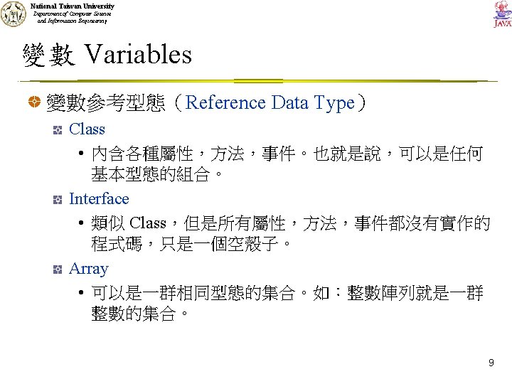 National Taiwan University Department of Computer Science and Information Engineering 變數 Variables 變數存取型態 基本型態(Primitive Type)- 直接存取 • 整數、浮點數、字元、或布林值 參考型態(Reference Type)- 間接存取 • 由物件所組成的型態 8