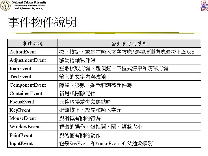 National Taiwan University Department of Computer Science and Information Engineering Events 以物件來表示 所有的事件都是 Event. Object的子類別 n所有的訊息都包含在java. awt. event類別庫內