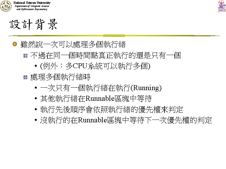 National Taiwan University Department of Computer Science and Information Engineering Important Features of Java 何謂多 (Multi-tasking) 例如,撰寫網路程式,模擬程式。 Java 利用 “執行緒” (Thread) 來實作多 可將一個Process分成數份, 讓各部份能同時被執行。