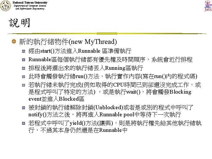 National Taiwan University Department of Computer Science and Information Engineering 執行緒的生命週期 start() notify(), I/O unblock Blocked Runnable sleep(), wait(), , I/O block Running yield()