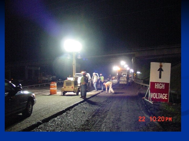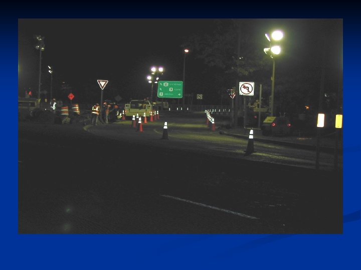 Nighttime Work Zones n There are many reasons for doing construction and maintenance at night. Safety n Cost n Congestion n Community Issues n Productivity n