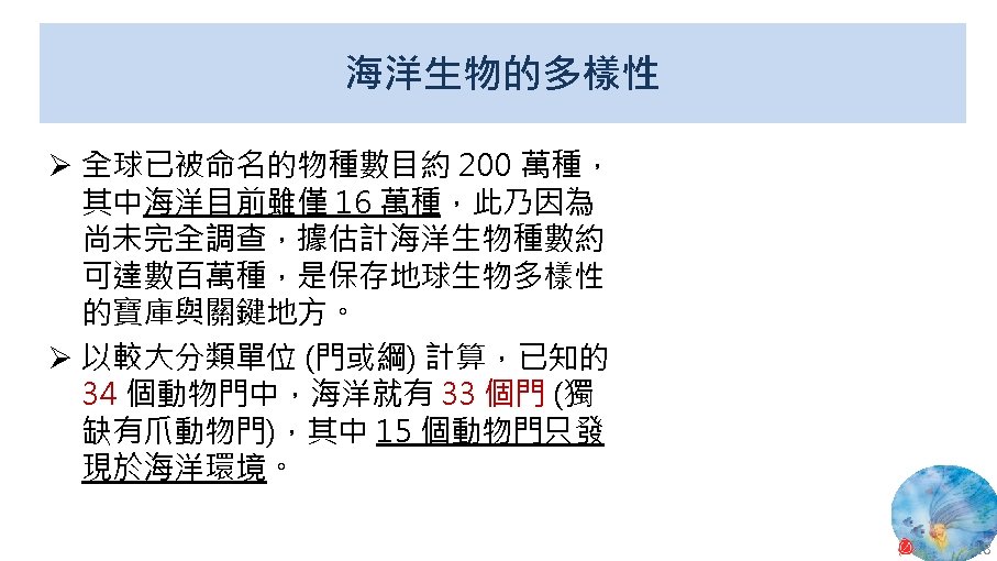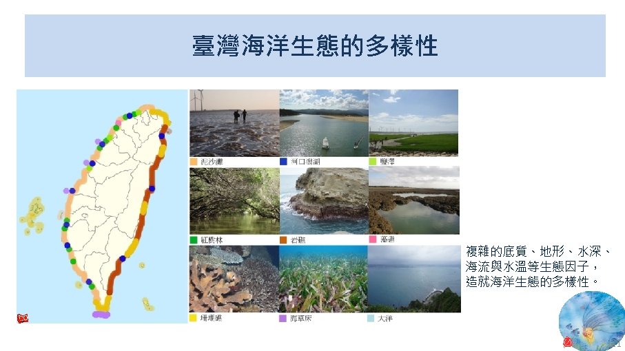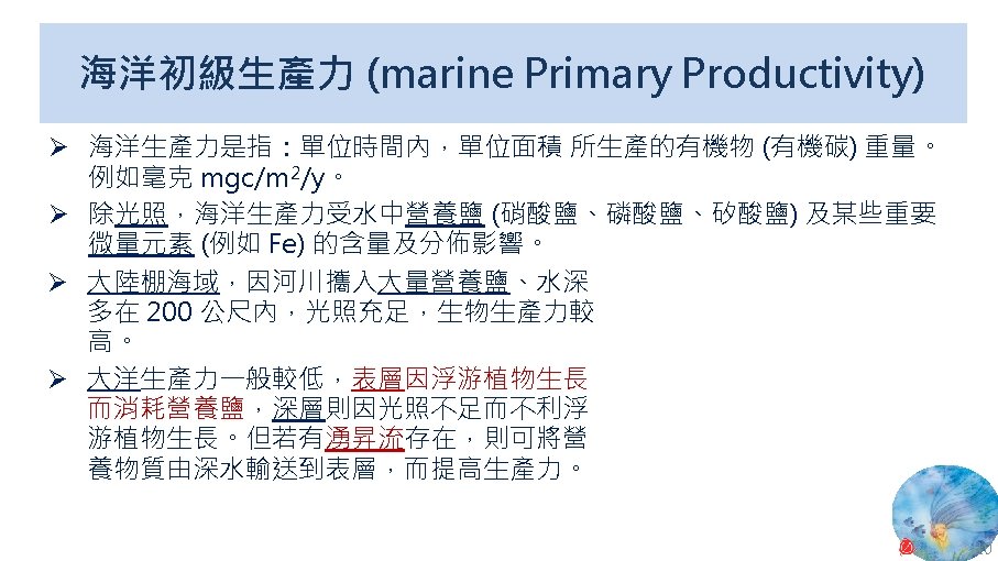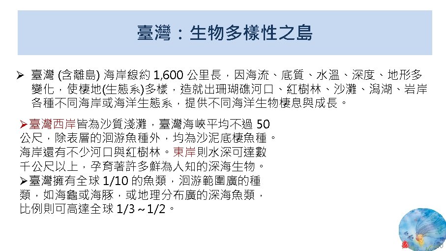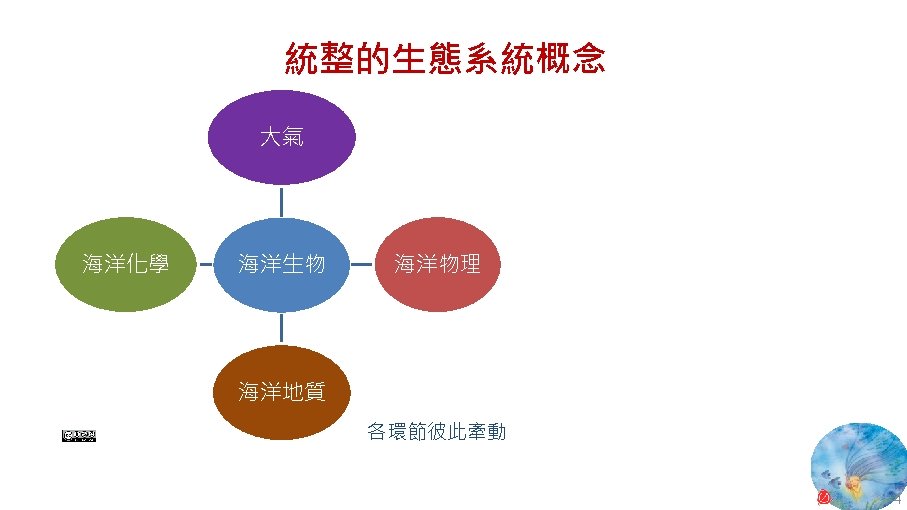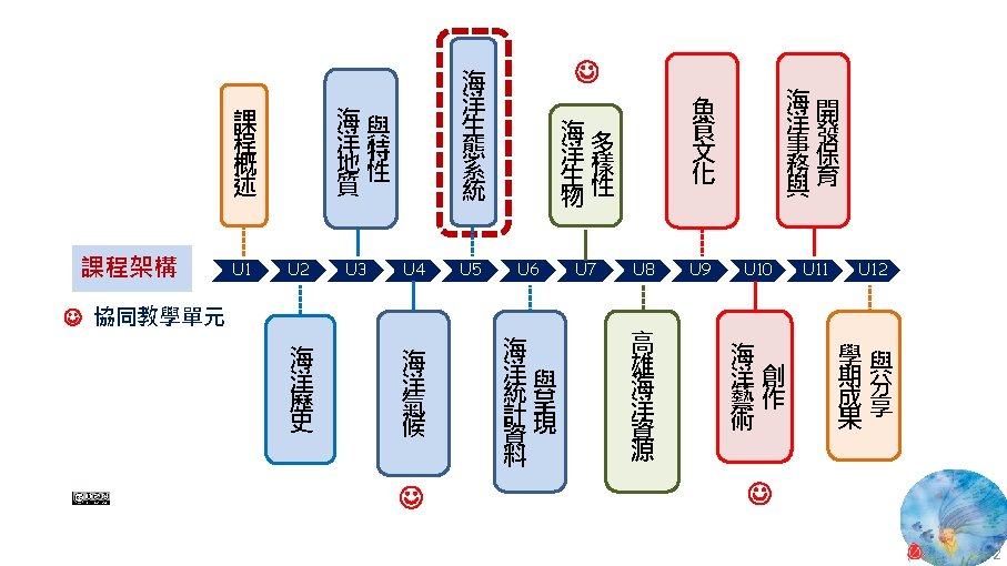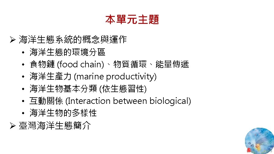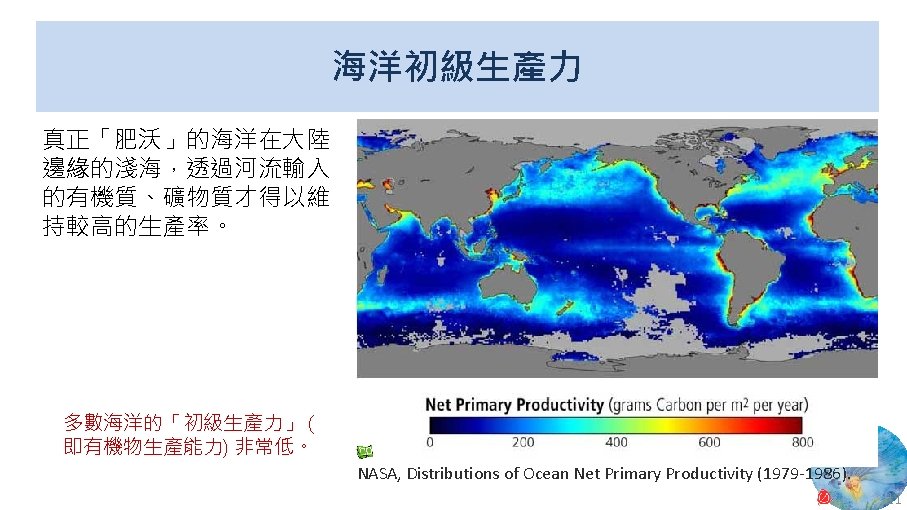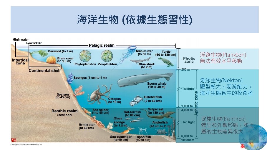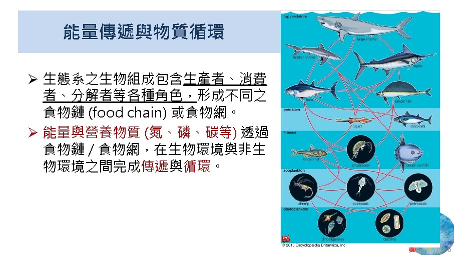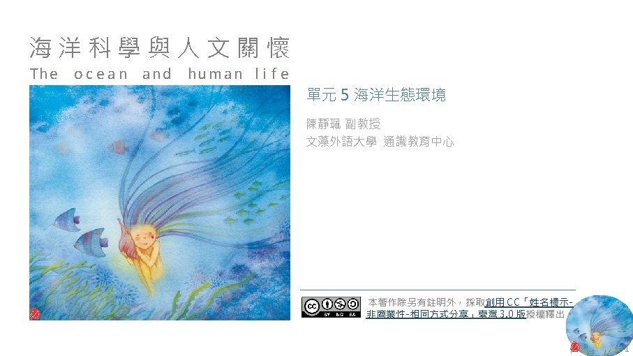 版權聲明 序 頁 作品 授權條件 作者/來源 11 NASA, Image 2: Distributions of Ocean Net Primary Productivity (1979 -1986). https: //www. nasa. gov/centers/goddard/news/topstory/2003/0815 oceancarbon. html The information on National Aeronautics and Space Administration (NASA) Web pages are in the public domain. 2017/5/19 visited. 8 12 Biology : concepts & connections / Neil A. Campbell and others / San Francisco : Pearson/Benjamin Cummings, © 2009, 6 th ed. This work is from Pearson and used/modified subject to the fair use doctrine in accordance with: Taiwan Copyright Act Articles 46 & 52 & 65, 2017/5/19 visited. The "Code of Best Practices in Fair Use for Open. Course. Ware 2009" by A Committee of Practitioners of Open. Course. Ware in the U. S. The contents are based on Section 107 of the 1976 U. S. Copyright Act. 9 13 文藻外語大學, 陳靜珮 採取創用 CC「姓名標示-非商業性-相同方式分享」臺灣 3. 0 版授權釋出。 10 14 Exploring Nature Science Education Resource: Life Science, Earth Science, and Physical Science Resources for K-12 https: //www. exploringnature. org/ 2017/5/19 visited. The material on this site may not be reproduced, distributed, transmitted, cached or otherwise used for anything other than free educational use. 11 17 Youtube Underwater astonishments | David Gallo 2008. 1. 14 https: //www. youtube. com/watch? v=YVvn 8 dp. SAt 0 (4: 34) 依著作權法第 46、52、65 條主張合理使用 2017/5/19 visited. 21 National Geographic 氣候變遷對臺灣海洋的影響 (上) 2015/5/13 http: //www. natgeomedia. com/news/ngnews/13860 依著作權法第 46、52、65 條主張合理使用 2017/5/19 visited. 7 12 45