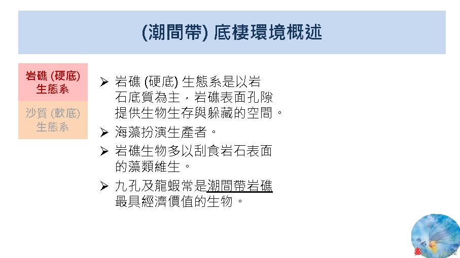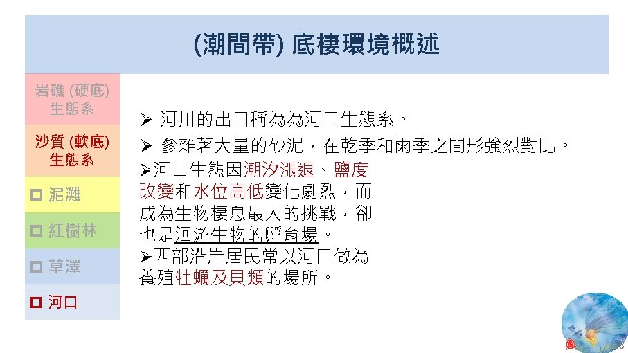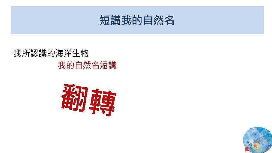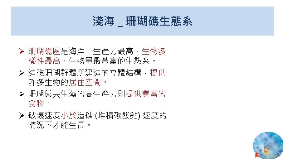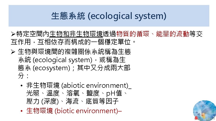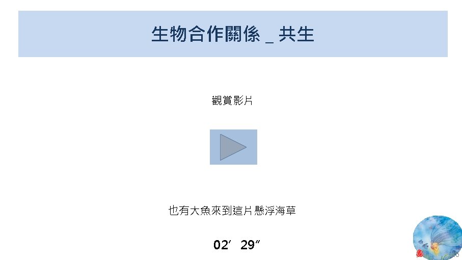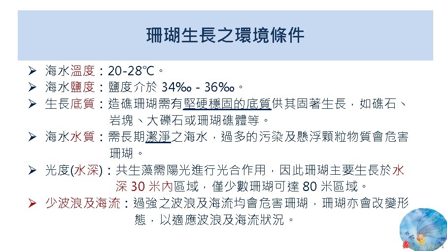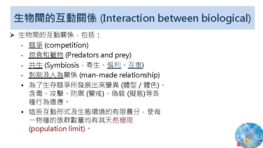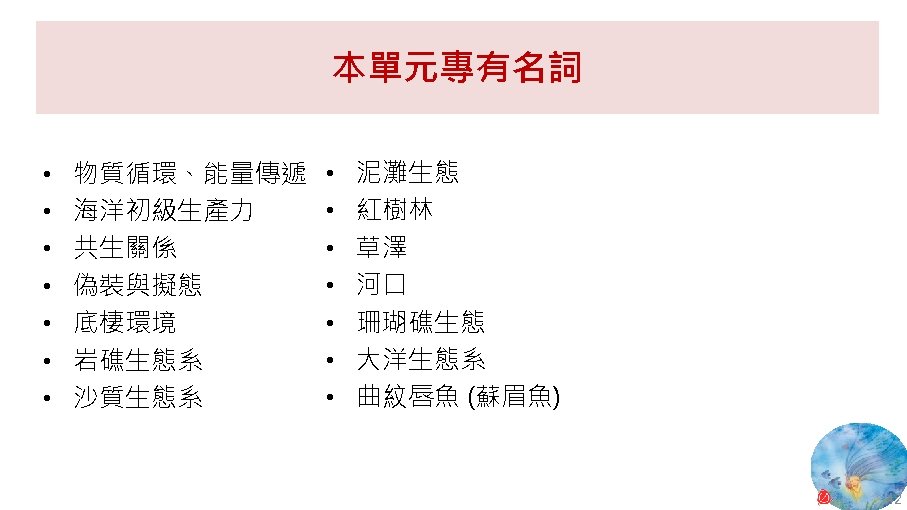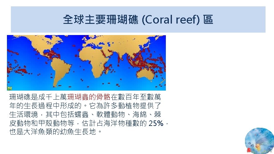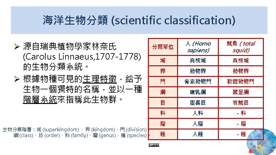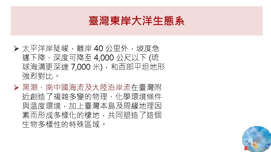 版權聲明 序 頁 作品 授權條件 作者/來源 11 NASA, Image 2: Distributions of Ocean Net Primary Productivity (1979 -1986). https: //www. nasa. gov/centers/goddard/news/topstory/2003/0815 oceancarbon. html The information on National Aeronautics and Space Administration (NASA) Web pages are in the public domain. 2017/5/19 visited. 8 12 Biology : concepts & connections / Neil A. Campbell and others / San Francisco : Pearson/Benjamin Cummings, © 2009, 6 th ed. This work is from Pearson and used/modified subject to the fair use doctrine in accordance with: Taiwan Copyright Act Articles 46 & 52 & 65, 2017/5/19 visited. The "Code of Best Practices in Fair Use for Open. Course. Ware 2009" by A Committee of Practitioners of Open. Course. Ware in the U. S. The contents are based on Section 107 of the 1976 U. S. Copyright Act. 9 13 文藻外語大學, 陳靜珮 採取創用 CC「姓名標示-非商業性-相同方式分享」臺灣 3. 0 版授權釋出。 10 14 Exploring Nature Science Education Resource: Life Science, Earth Science, and Physical Science Resources for K-12 https: //www. exploringnature. org/ 2017/5/19 visited. The material on this site may not be reproduced, distributed, transmitted, cached or otherwise used for anything other than free educational use. 11 17 Youtube Underwater astonishments | David Gallo 2008. 1. 14 https: //www. youtube. com/watch? v=YVvn 8 dp. SAt 0 (4: 34) 依著作權法第 46、52、65 條主張合理使用 2017/5/19 visited. 21 National Geographic 氣候變遷對臺灣海洋的影響 (上) 2015/5/13 http: //www. natgeomedia. com/news/ngnews/13860 依著作權法第 46、52、65 條主張合理使用 2017/5/19 visited. 7 12 45