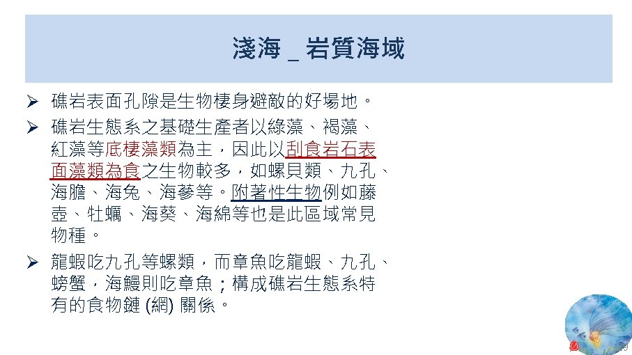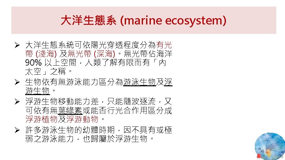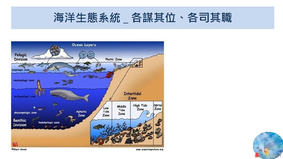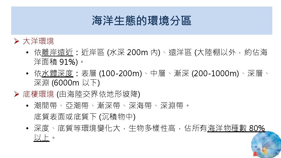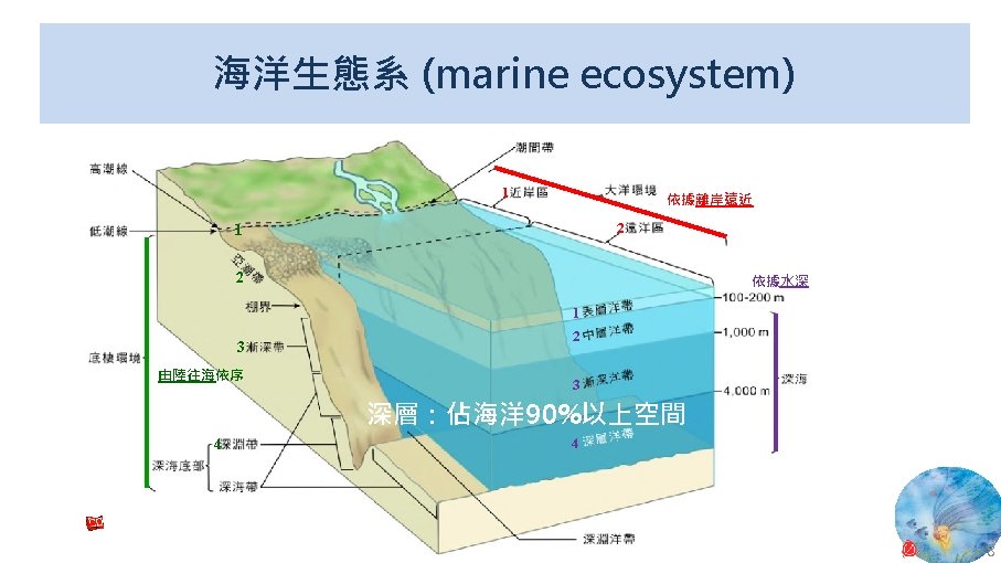 海洋生態系統位置 表層 中層 深海 深淵 超深淵 National Weather Service, National Oceanic and Atmospheric Administration (NOAA), U. S. Department of Commerce, Profile of the Ocean. 9