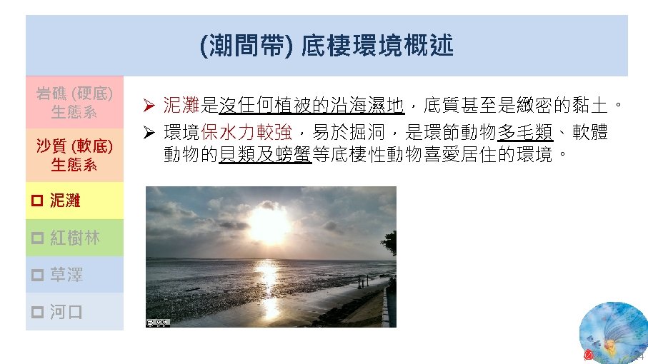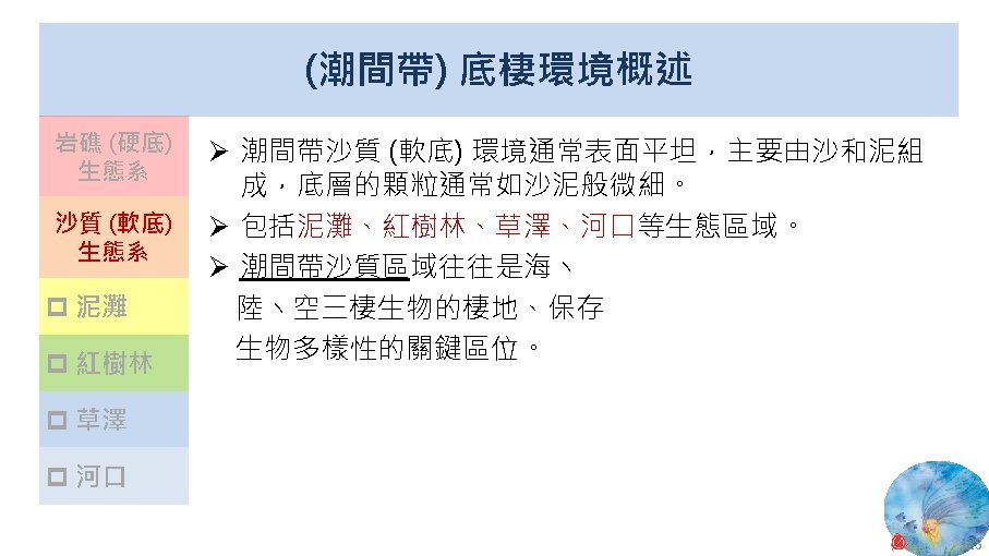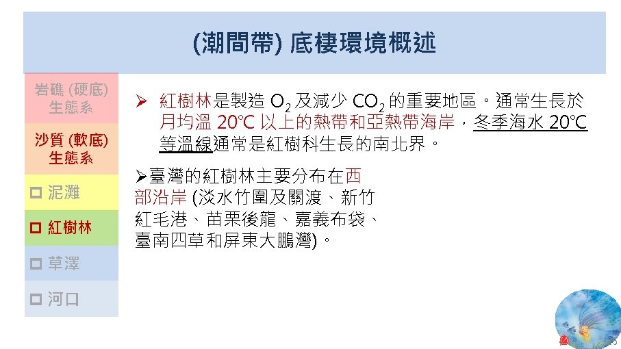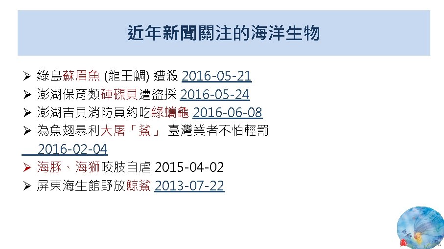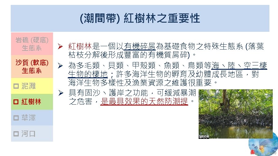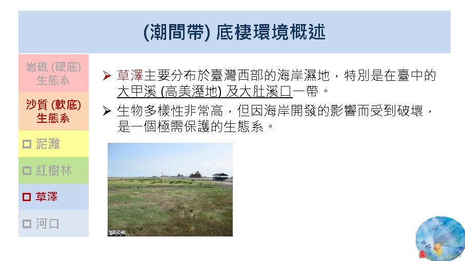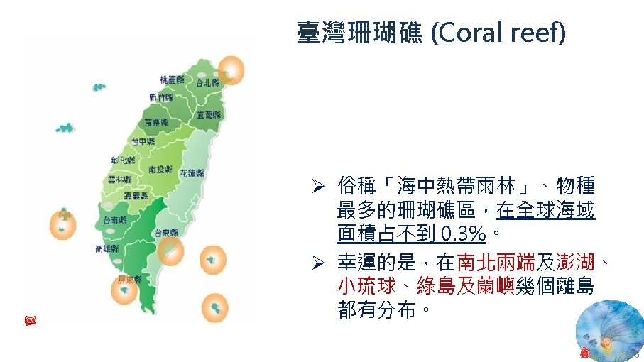 版權聲明 序 頁 作品 授權條件 作者/來源 13 24 Wikimedia Commons 大肚溪口濕地 fcuk 1203 https: //zh. wikipedia. org/wiki/File: %E 5%A 4%A 7%E 8%82%9 A%E 6%BA%AA%E 5%8 F%A 3%E 9%87%8 E% E 7%94%9 F%E 5%8 B%95%E 7%89%A 9%E 4%BF%9 D%E 8%AD%B 7%E 5%8 D%80. jpg 此檔案採用創用CC 姓名標示-相同方式分享 4. 0 國際條款授權。2017/5/19 visited. 14 26 Wikimedia Commons 紅樹林 Leon petrosyan https: //commons. wikimedia. org/wiki/File: Mangrove-1. JPG 2017/5/19 visited. This file is licensed under the Creative Commons Attribution-Share Alike 3. 0 Unported license. 27 Wikimedia Commons Panoramic of Gaomei Wetland Yiken https: //commons. wikimedia. org/wiki/File: Panoramic_of_Gaomei_Wetland. JPG 2017/5/19 visited. This file is licensed under the Creative Commons Attribution-Share Alike 3. 0 Unported license. 32 National Aeronautics and Space Administration (NASA) New Worldwide Coral Reef Library Created 11. 04 https: //www. nasa. gov/vision/earth/lookingatearth/coralreef_image. html The information on National Aeronautics and Space Administration (NASA) Web pages are in the public domain. 2017/5/19 visited. 33 2010 臺灣珊瑚礁總體檢 (Reef Check) 成果報告書 臺灣環境資訊協會 2010 年 12 月 https: //image. slidesharecdn. com/6380684/95/2010 -1 -728. jpg? cb=1448419206 依著作權法第 46、52、65 條主張合理使用 2017/5/19 visited. 35 Wikimedia Commons Coralreef Richard Ling wikipedia@rling. com https: //commons. wikimedia. org/wiki/File: Blue_Linckia_Starfish. JPG 2017/5/19 visited. A copy of the license is included in the section entitled GNU Free Documentation License. 15 16 17 18 46