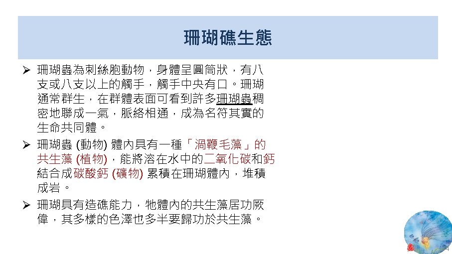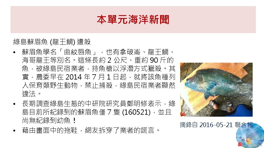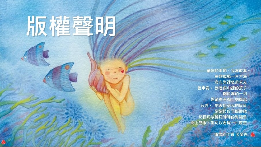 版權聲明 序 頁 作品 授權條件 作者/來源 19 35 National Weather Service, National Oceanic and Atmospheric Administration (NOAA), U. S. Department of Commerce, Corals-What Are Corals? http: //oceanservice. noaa. gov/education/tutorial_corals/coral 01_intro. html 2017/5/19 visited. The information on National Weather Service (NWS) Web pages are in the public domain. 20 41 聯合新聞網 綠島保育蘇眉魚疑遭殺 網路狂轉專家慟 https: //udn. com/news/story/7266/1710600 依著作權法第 46、52、65 條主張合理使用 2017/5/19 visited. 21 童年的季節, 我喜歡海。 …… 43 閉上雙眼,就 可以看見一片 蔚藍。 Facebook 法蘭克 https: //www. facebook. com/photo. php? fbid=139794386150055&set=pb. 100003584829216. 2207520000. 1405326151. &type=3&theater 2016/5/19 visited. 本作品由法蘭克授權使用,本中心無再授權他人使用之權利,如需使用,請另行向權利人取得授權。 47