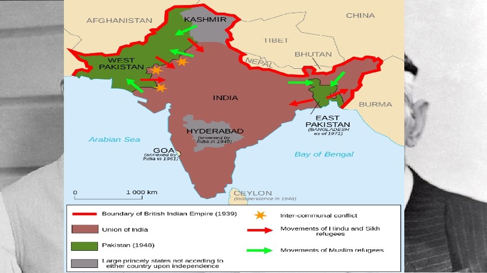 INDEPENDENCE IN THE SOUTH AND SE ASIA • Indian National Congress • Offered support to the Allies in exchange for independence • Rejected • Quiet Indian Movement • Mass civil disobedience movement to end British rule in India • British responded with mass arrests & repression • Gandhi, Nehru, and other Congress politicians were imprisoned • Independence is granted August 15, 1947 • Split into India and Pakistan