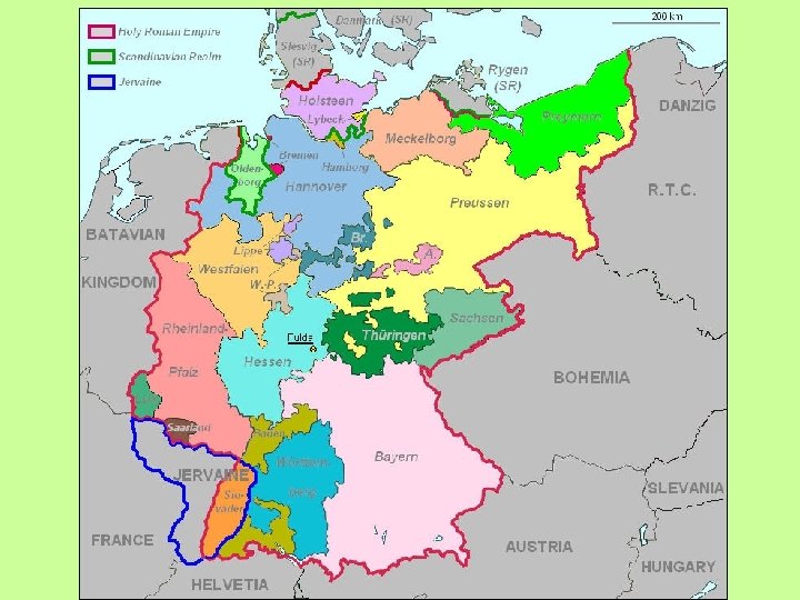 (b) The Deutscher Bund (German Confederation) • • • After Napoleon’s defeat, and the expulsion of the French, ‘Germany’ was reformed in 1815 into 39 states. The Confederation of the Rhine was replaced by the German Confederation. Nationalists hoped that this ‘Bund’ would be the beginning of a united German state.