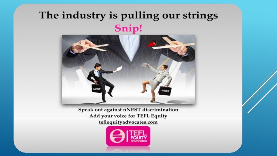 Selvi, A. F. (2010). All teachers are equal, but some teachers are more equal than others: Trend analysis of job advertisements in English language teaching. WATESOL NNEST Caucus Annual Review, 1, 155– 181. Selvi, A. F. (2014). Myths and misconceptions about nonnative English speakers in the TESOL (NNEST) movement. TESOL Journal, 5, 573– 611. http: //dx. doi. org/10. 1002/tesj. 158 TESOL (2006). Position statement against discrimination of nonnative speakers of English in the field of TESOL. <http: //www. tesol. org>. Thomas, J. (1999). Voices from the Periphery: Non-native teachers and issues of credibility. In Braine (ed. ), 5– 14. Tsui, A. B. (2003). Understanding expertise in teaching. Cambridge: Cambridge University Press. Valdes, G. (1998). The construct of near-native speaker in a foreign language profession: Perspectives on ideologies about language. ADFL Bulletin 29. 3, 4– 8. https: //teflequityadvocates. com/