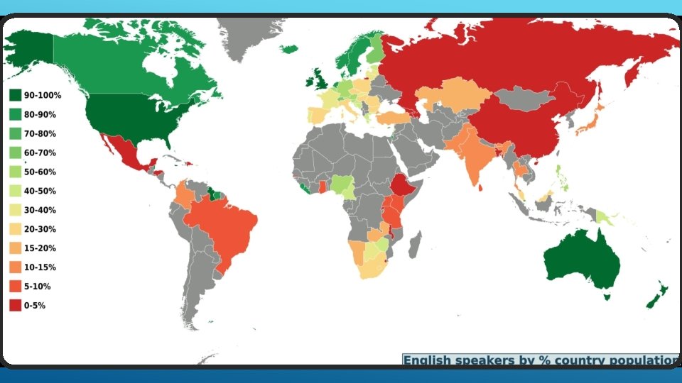 The percentage of native English speakers living in "inner circle" English-speaking countries. Native speakers are now substantially outnumbered worldwide by secondlanguage speakers of English Ø United States (64. 3%) Ø United Kingdom (16. 7%) Ø Canada (5. 3%) Ø Australia (4. 7%) Ø South Africa (1. 3%) Ø Republic of Ireland (1. 1%) Ø New Zealand (1%) Other (5. 6%)