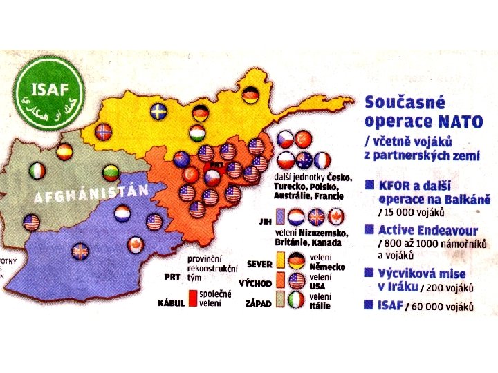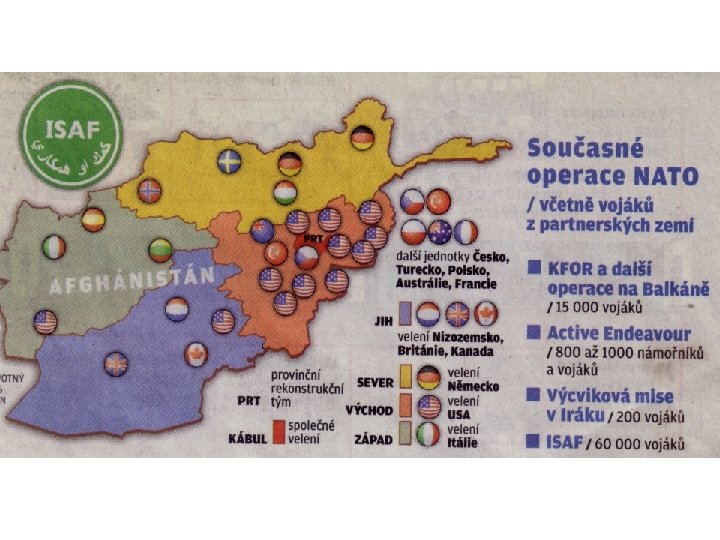 Operace NATO v Afghánistánu Mise ISAF Lógar § mandát mise je vymezen rezolucí Rady bezpečnosti OSN č. 1386 z roku 2001, která síly ISAF zmocnila pomáhat afghánským orgánům při zajišťování bezpečnosti, § rozšíření působení sil ISAF na celé území Afghánistánu schválila RB OSN rezolucí č. 1510 v roce 2003, § kontingent AČR je vysílán na základě usnesení Poslanecké sněmovny Parlamentu ČR č. 1285 ze dne 16. června 2009 a usnesení Senátu Parlametu ČR č. 208 ze dne 17. června 2009. Aktuální počet českých občanů v PRT Lógar: § 288 vojáků 5. kontingentu AČR, § 12 civilních expertů.