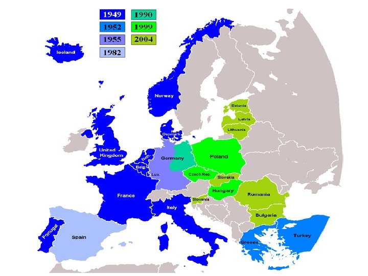Severoatlantická smlouva (Washington D. C. , 4. 4. 1949) Strany této smlouvy mají snahu žít v míru se všemi národy, hájit svobodu, společné dědictví a kulturu svých národů , spojit úsilí o kolektivní obranu Smlouva obsahuje celkem 14 článků • • Řešení sporů mírovými prostředky Udržovat a rozvíjet svoji individuální i kolektivní schopnost odolat ozbrojenému útoku • Stabilita, blahobyt, hospodářská spolupráce • Společné konzultace při ohrožení územní celistvosti, politické nezávislosti nebo bezpečnosti kterékoli smluvní strany 5. Ozbrojený útok proti jedné nebo více členům v Evropě nebo v Severní Americe bude považován za útok proti všem ( pomoc spojenců, včetně použití ozbrojené síly) ………. 10, Možnost přistoupení jiných evropských států ………. 13. Odstoupení od smlouvy