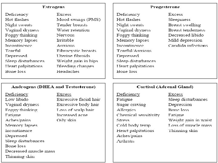 Progesterone Balancing Effects of Excess Estrogen • • • • Stimulates fast-multiplying cells in uterine lining Causes breast stimulation Increase body fat Depression and headaches Salt and fluid retention Interferes with thyroid function Increase blood clotting Decrease sex drive Impairs blood sugar control Loss of zinc and retention of copper Reduces oxygen levels in all cells Increases risk of endometrial cancer Increases risk of breast cancer Reduces strength of blood vessels • • • • Maintains nourishing uterine lining Protects against fibrocystic breasts Helps use fat for energy Natural anti-depressant Natural diuretic Facilitates thyroid hormone action Normalizes blood clotting Restores sex drive Normalizes blood sugar levels Normalizes zinc and copper levels Restores proper oxygen levels Helps prevent endometrial cancer Helps prevent breast cancer Restores strength of blood vessels