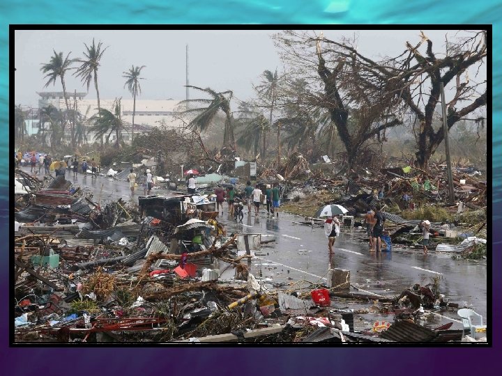 • Friday, November 8, 2013 • one of the strongest cyclones ever measured = 190 miles per hour • resulted in high numbers of victims • > 6, 000 people were killed, and hundreds of thousands had to abandon their homes (4. 28 million people and at least 270 town) • destruction on a massive scale in the islands of Samar, Leyte, Cebu and Panay