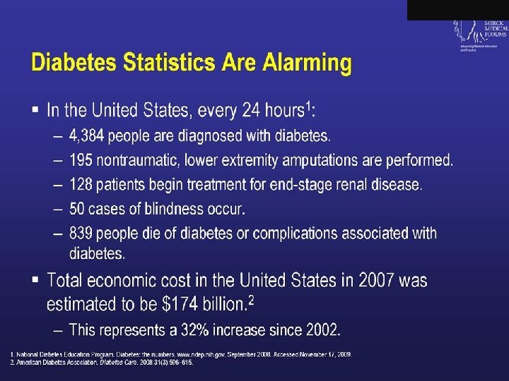 Natural History of Type 2 Diabetes: Disease Progression Genetic Susceptibility Onset of Diabetes Environmental Factors: Nutrition Obesity Physical inactivity IGT Insulin resistance Hyperinsulinemia HDL-C TG Complications Disability Ongoing Hyperglycemia Atherosclerosis Hyperglycemia Hypertension De. Fronzo RA et al. Diabetes Care. 1992; 15: 318 -368. Retinopathy Nephropathy Neuropathy Death Blindness Renal failure CHD Amputation