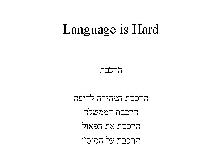 Language is Hard • I saw a man on the hill with a telescope Who has the telescope? Who is on the hill? (and this takes for granted that the sentence is not about a very cruel way of killing someone)