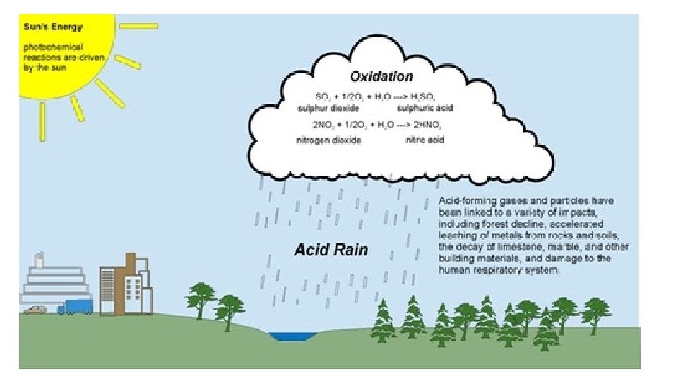 What is acid rain? • Acid rain refers to a mixture of deposited material, both wet and dry, coming from the atmosphere containing more than normal amounts of nitric and sulfuric acids. The most acidic rain falling in the U. S. has a p. H of about 4. 3. • Canada, northeastern United States and most of Europe, including portions of Sweden, Norway, and Germany. • Found in parts of South Asia, South Africa, Sri Lanka, and Southern India. • It was discovered way back in 1800 s during the Industrial Revolution. A Scottish chemist, Robert Angus Smith.