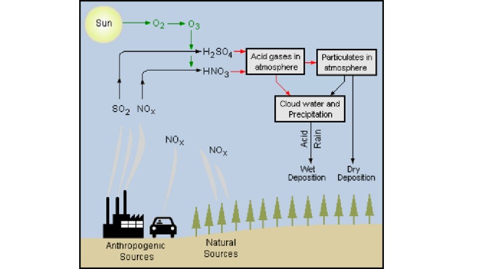 Causes of Acid Rain • Both natural and man-made sources are known to play a role in the formation of acid rain. But, it is mainly caused by combustion of fossil fuels which results in emissions of sulfur dioxide (SO 2) and nitrogen oxides (NOx). • Natural sources such as erupting volcanoes, rotting vegetation and sea sprays produce sulfur dioxide and fires, bacterial decomposition and lightening generate nitrogen dioxide. The chemicals released by natural sources gets mixed up with water and oxygen and are disperse over large areas because of wind patterns. • Man-made sources include emission of sulfur dioxide and nitrogen oxides due to combustion of fossil fuels. • These gases react in the atmosphere with water, oxygen, and other chemicals to form various acidic compounds such as sulfuric acid, ammonium nitrate, and nitric acid. • The gases i. e. sulfur dioxide (SO 2) and nitrogen oxides (NOx) are primarily gases occurring from electric power generation by burning coal and responsible for acid rain.