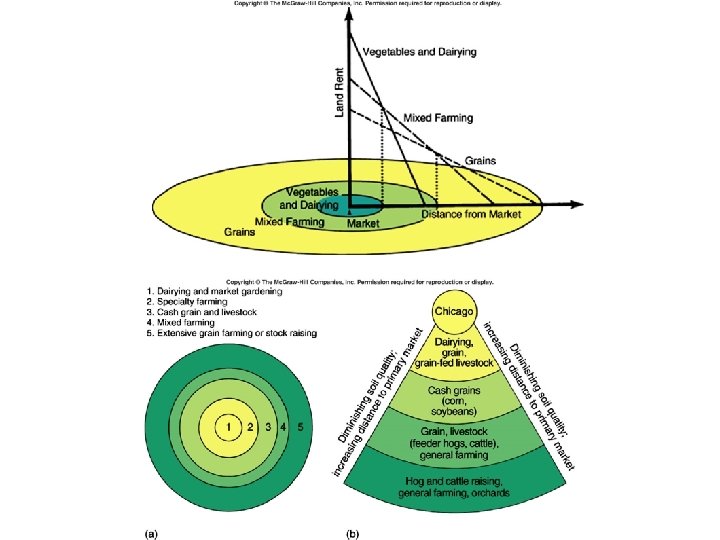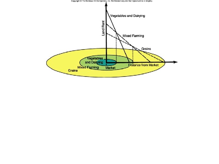 Von Thünen’s land use model • German landowner in 1800 s • Noticed pattern of agricultural land use • Three assumptions: – Isolated city (no trade) – Surrounded by homogenous landscape – All that matters is transport costs