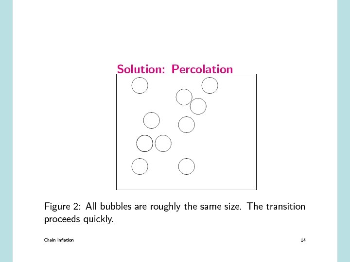 Swiss Cheese Problem of Old Inflation: no graceful exit Bubbles of true vacuum nucleate in a sea of false vacuum. PROBLEM: Bubbles never percolate and thermalize: REHEATING FAILS; we don’t live in a vacuum