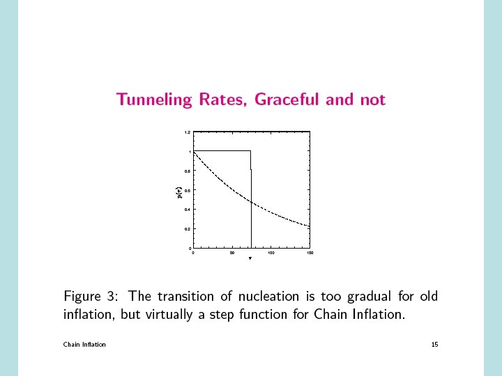 How to achieve both criteria: • • Sufficient inflation: Reheating: With single tunneling event: “Double Field Inflation” (Adams + Freese 91; Linde 91) : time-dependent nucleation rate, couple two scalar fields • With multiple tunneling events: CHAIN INFLATION get a fraction of an e-fold at each stage, adds to more than 60 in the end