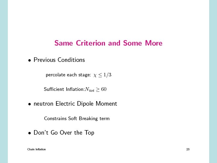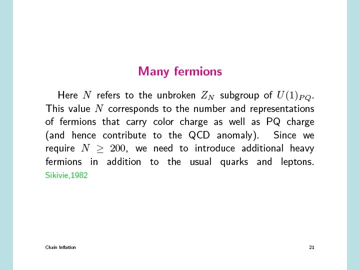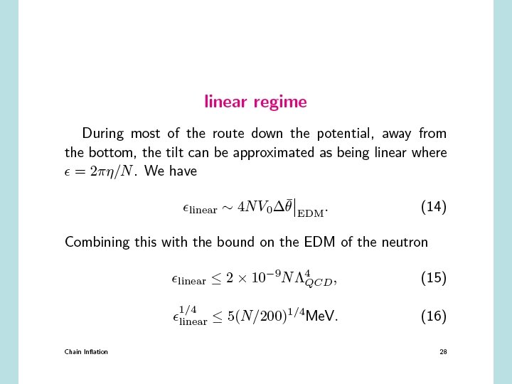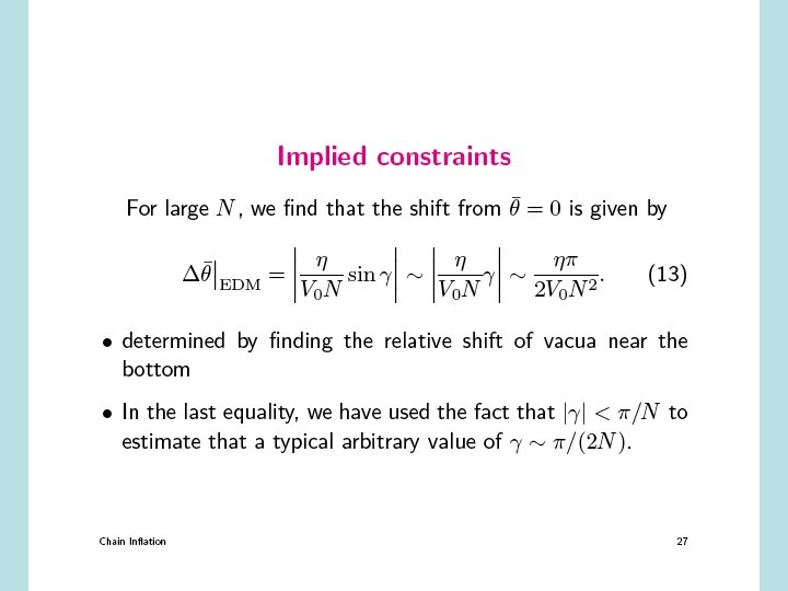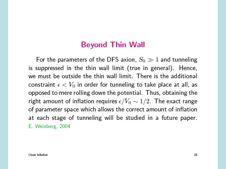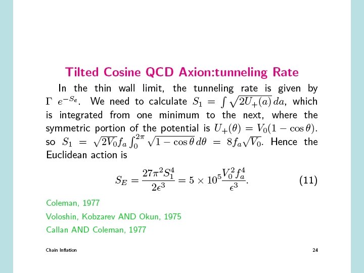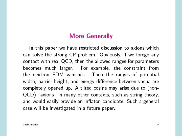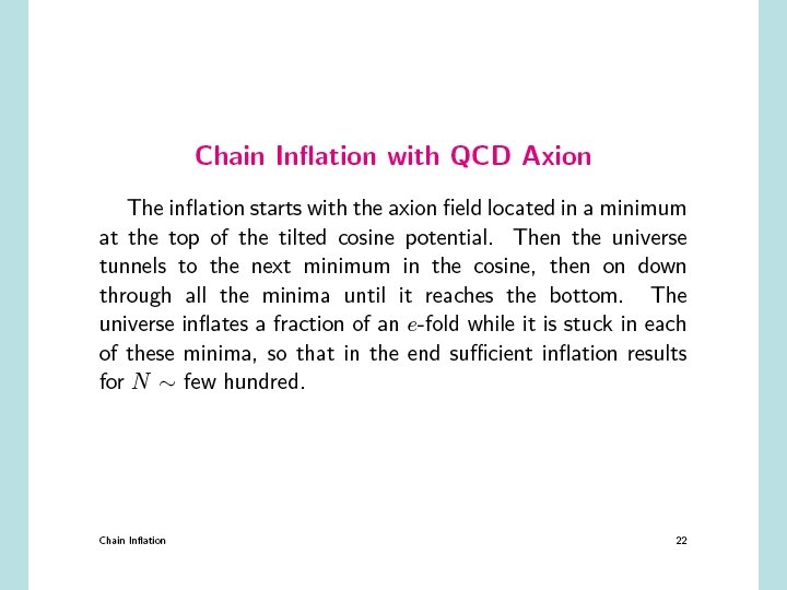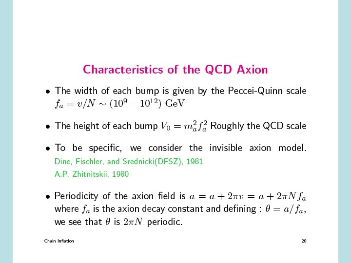 CHAIN INFLATING WITH THE QCD AXION: Conclusion • Can inflate with the QCD axion, a particle proposed for independent reasons (strong CP problem) (Wilczek, Weinberg) • Scale of inflation is low: testable • Need tilted cosine (soft breaking of PQ symmetry) with many minima, tunnel from one minimum to the next • Graceful exit is resolved, reheating is successful