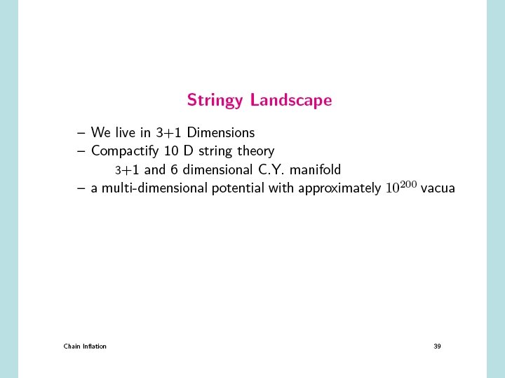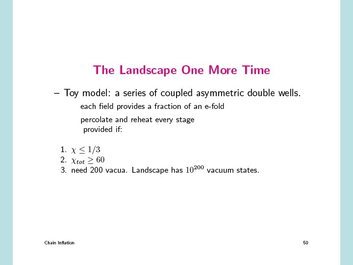 Key ingredients provided by the landscape • Many minima: required for chain inflation to work • Many interacting fields: tend to drive the tunneling rate to speed up • Will the field get stuck in a minimum and overinflate there? Unlikely because it will choose the path of least resistance, I. e. go to a minimum out of which it can tunnel quickly. • Will the field skip ahead and leap over many minima? For equal parameters for all mimina, NO: the fastest path is to move sequentially. For unequal parameters, to move through largest potentials first and then smaller ones.