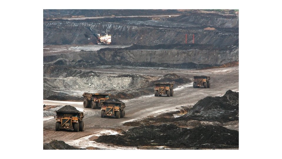 We mine and drill for fossil fuels • Oil sands are extracted using 2 methods • For surface deposits, a process like strip mining is used • Collected sands are mixed with hot water to separate out the bitumen • Produces three times as much polluted water as oil