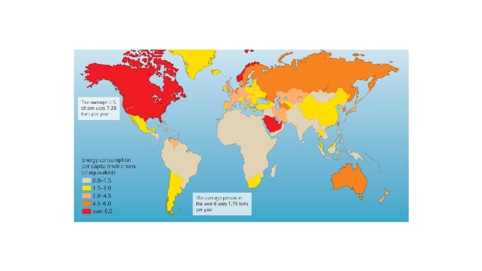 Fossil fuels dominate our energy use • Oil, coal, and natural gas have replaced biomass as our dominant sources of energy • high-energy content of fossil fuels makes them efficient to burn, ship, and store • transportation, manufacturing, heating, cooking and generating electricity