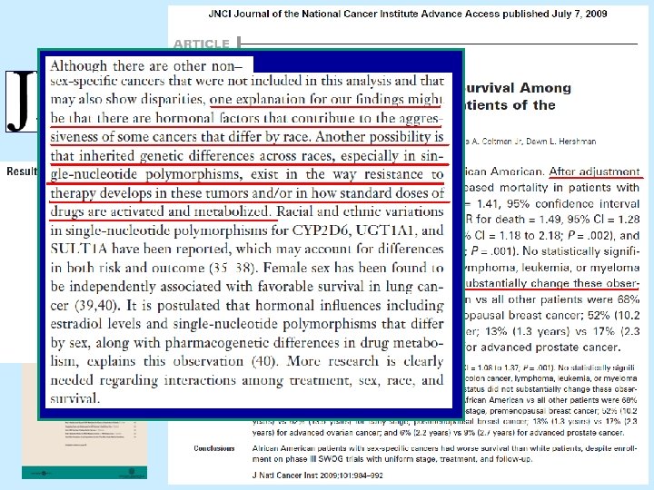 Definition of SES: Education category was similarly based on the proportion of residents in a zip code area who completed high school. For post-menopausal breast cancer, 32% of observations had no zip code data at all (missing SES varied 27 -79% depending on outcome) CONCLUSION: “The findings therefore suggest that the survival gap for these cancers is most likely due to an interaction of tumor biologic factors, hormonal environment, and inherited variations in genes that control metabolism of drugs, toxins and hormones. ”
