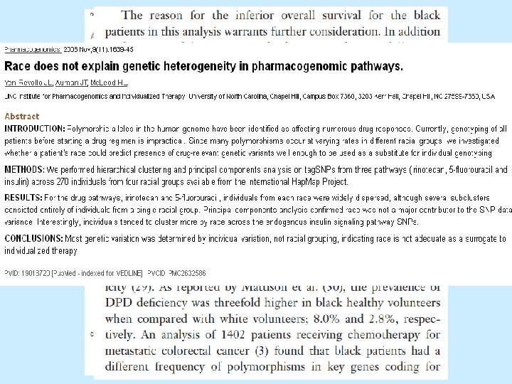To consider all unmeasured variables and decide that the one important unmeasured variable is a genetic trait requires a strong prior probability on that hypothesis. Is this in any way justifiable? How can one approach this question rationally? 1) The proportion of functional variants that have a substantively important prevalence difference between blacks and whites would be, say, smaller than 0. 001. Goldstein DB, Hirschhorn JN. In genetic control of disease, does 'race' matter? Nat Genet 2004; 36(12): 1243 -4. 2) What is a reasonable prior probability that racial/ethnic groups might differ on some unmeasured social factor that is consequential for disease? ? ? ?